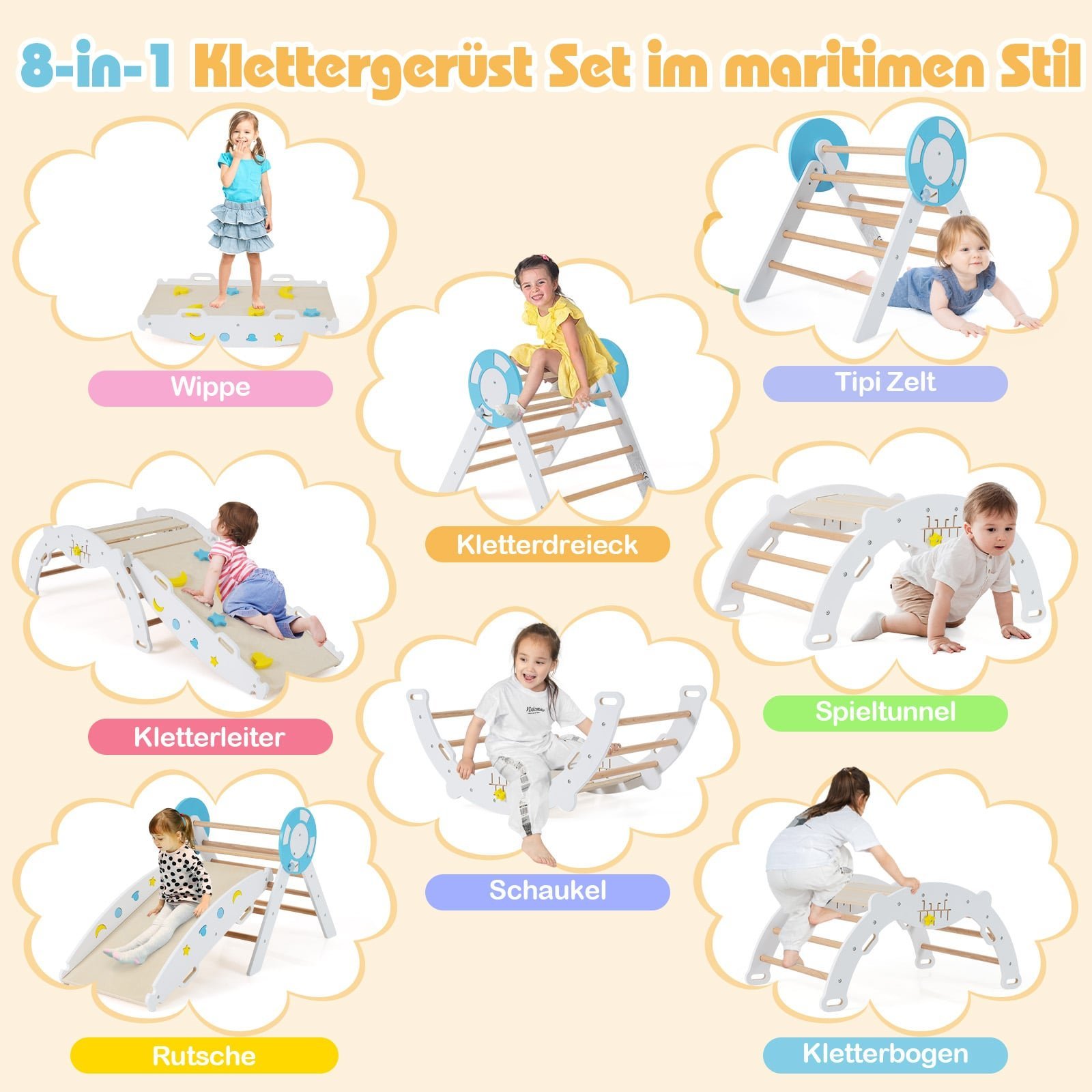 Šis daugiafunkcinis laipiojimo rinkinys su jūrine tematika skatina mažylių kūrybiškumą ir vaizduotę. Komplektą sudaro trikampis laipiojimo stovas, rampa ir kopimo arka, suteikiantys daugybę aktyvių žaidimų galimybių. Pagamintas iš tvirto buko medžio ir įkvėptas Montessori principų, šis rinkinys užtikrina saugią ir lavinančią aplinką mažiesiems tyrinėtojams. Dėl sulankstomo dizaino jį lengva patogiai laikyti, taupant vietą.