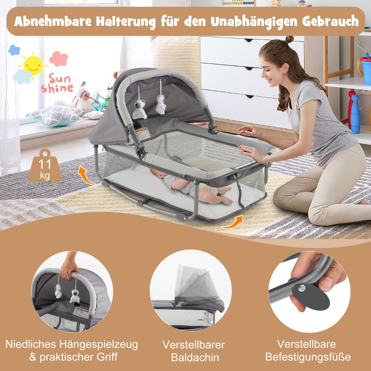 - Nuimamas lopšys su reguliuojamu stogeliu ir kabinamais žaisliukais kūdikio pramogai.
