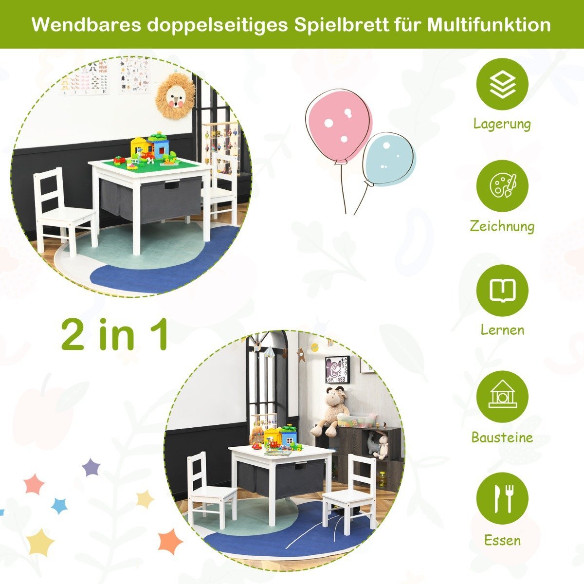 Padovanokite vaikams džiugių ir turiningų akimirkų su šiuo universaliu aktyvumo staliuku ir kėdučių rinkiniu. Tai puikus baldas, skatinantis kūrybiškumą ir padedantis palaikyti tvarką vaiko kambaryje.
