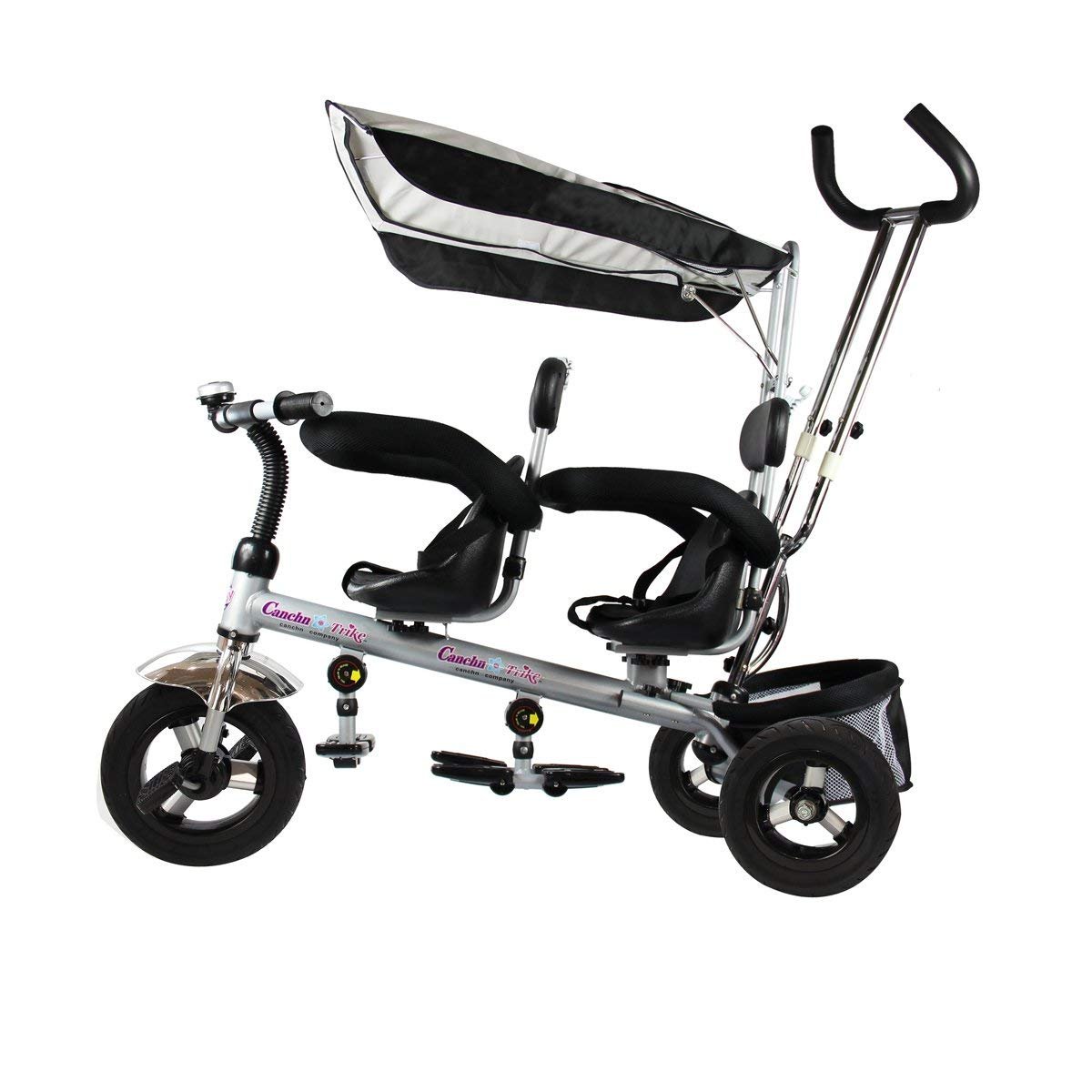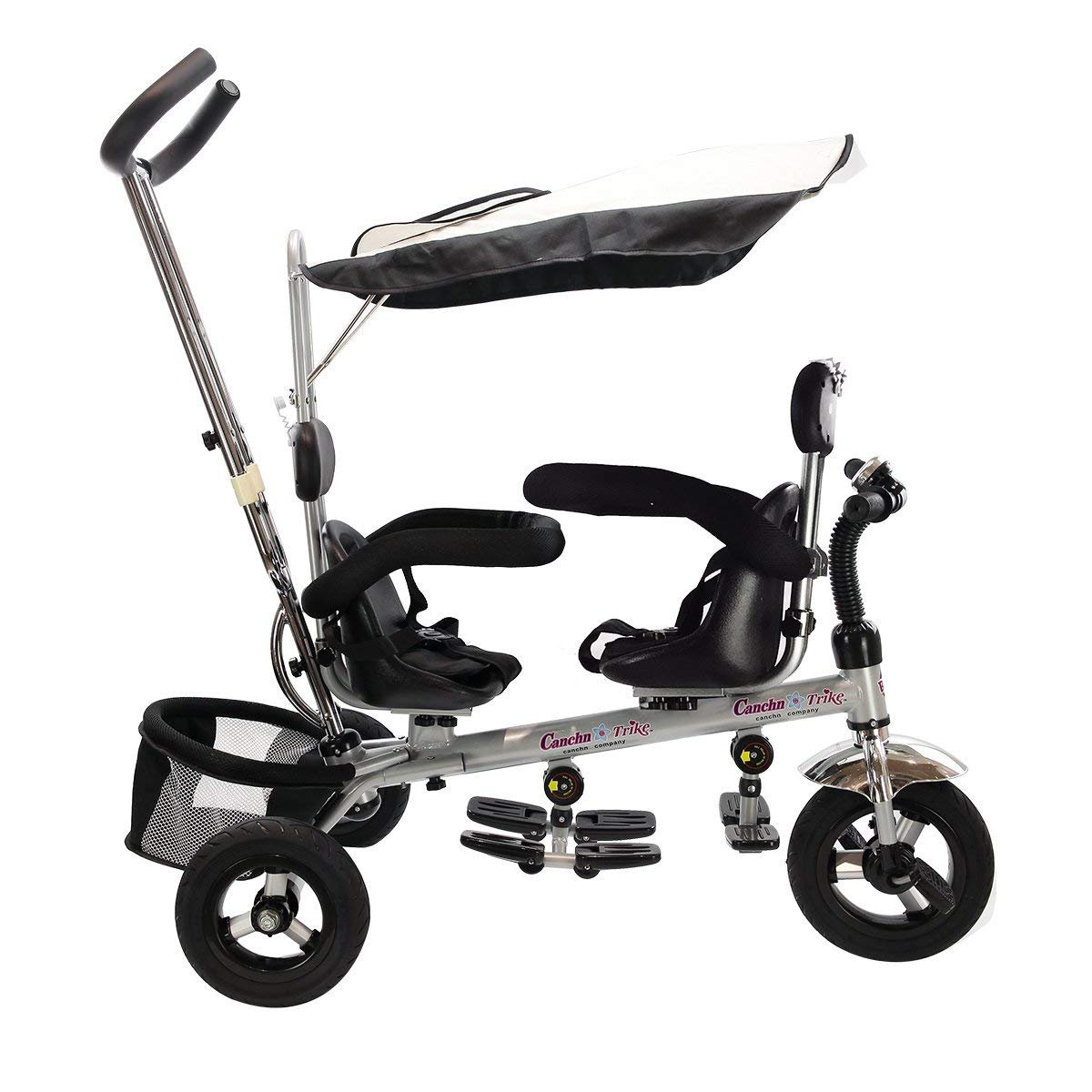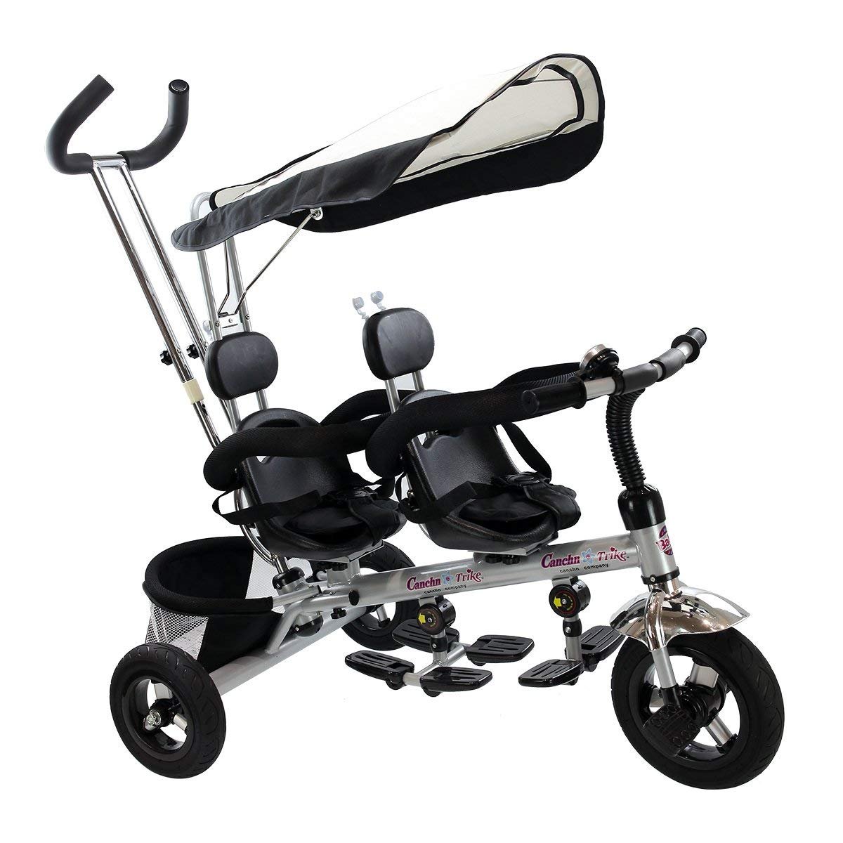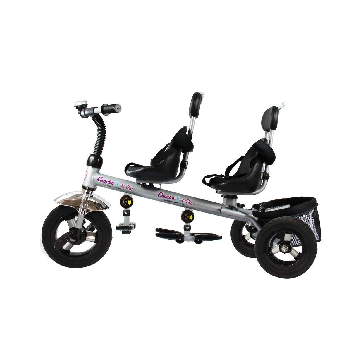 - Patogumas dvynukams: Dvi sėdynės (viena iš jų sukasi 360°) leidžia vaikams sėdėti vienas prieš kitą. Sulankstomos kojų atramos ir talpus krepšys žaislams triračio gale suteikia papildomo patogumo.