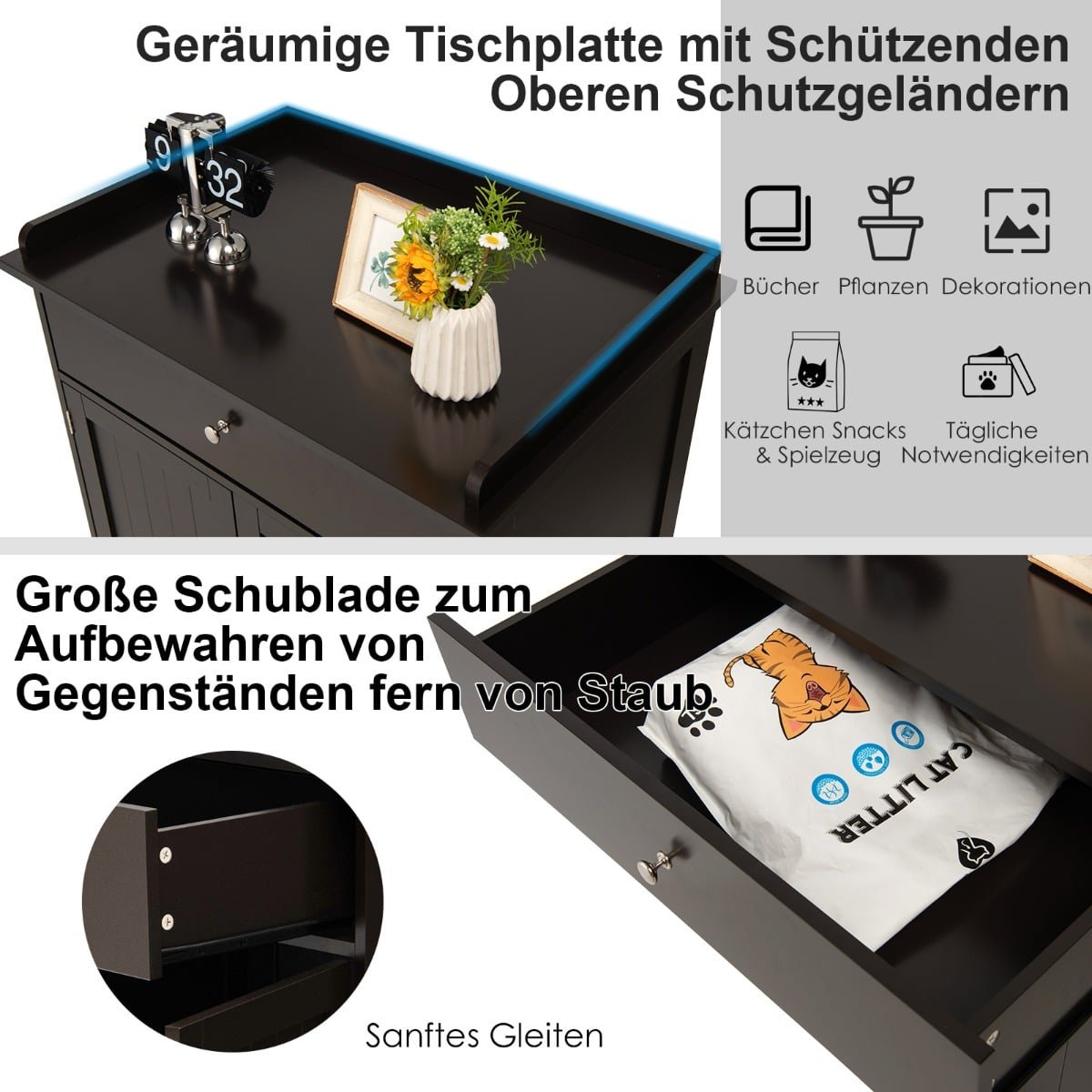 - 3-in-1 funkcionalumas: Gali būti naudojamas kaip kačių tualeto dėžės slėptuvė, jaukus namelis poilsiui arba stilingas šoninis staliukas su stalčiumi.