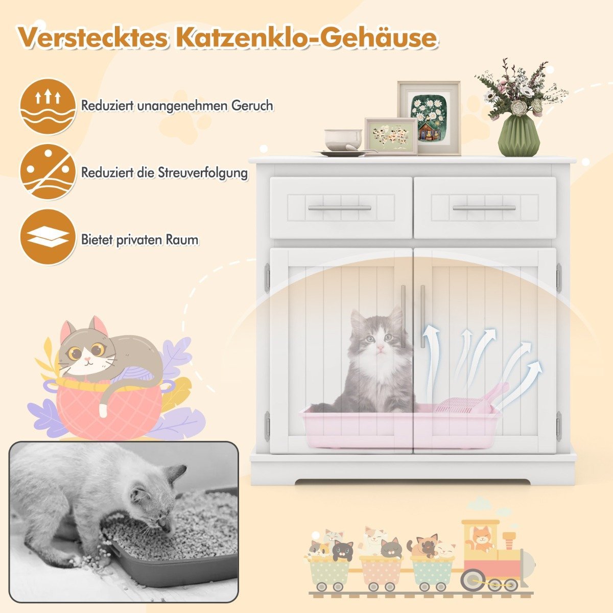 - Diskreti dizainas paslepia katės tualetą, sumažina kvapus ir kraiko barstymą.
