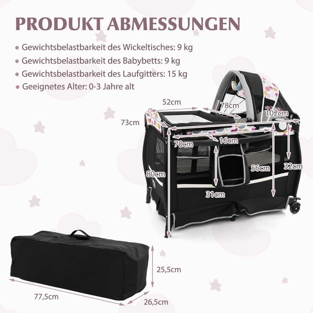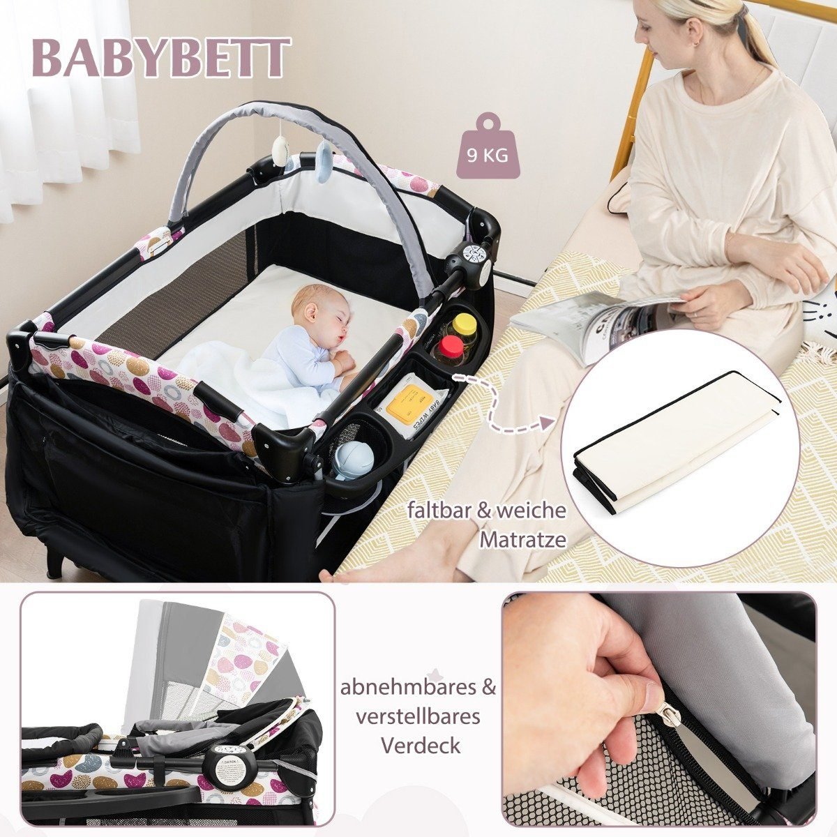- Keturi universalūs naudojimo būdai: lopšys, kūdikio lovelė, vystymo stalas ir žaidimų zona.