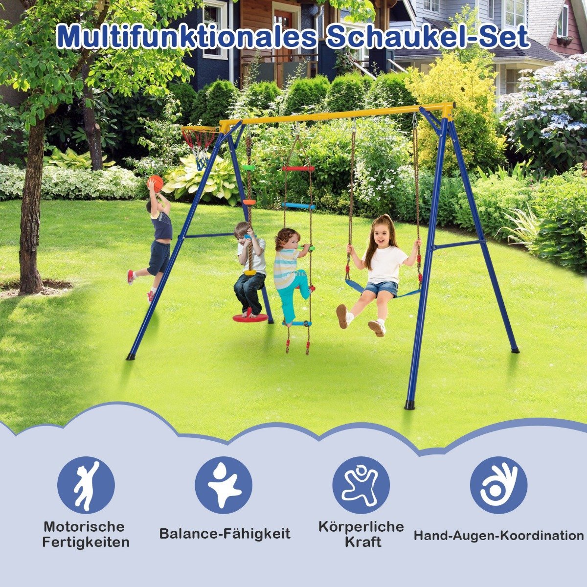 - 4-in-1 žaidimų sistema: krepšinio lankas, laipiojimo kopėtėlės, diskinė sūpynė ir juosmens sūpynė.