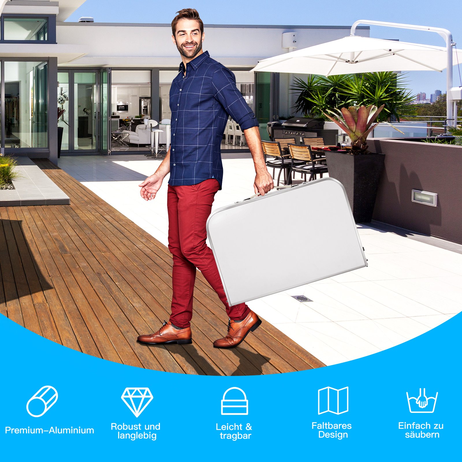 Ieškote praktiško ir patikimo sulankstomo stalo? Mūsų aliumininis stalviršis puikiai tiks įvairioms veikloms lauke ir viduje – nuo stovyklavimo ir iškylų iki vakarėlių sode. Tvirta metalinė konstrukcija ir kokybiška MDF plokštė užtikrina ilgaamžiškumą ir stabilumą, o dėl reguliuojamo aukščio stalas prisitaikys prie jūsų poreikių.