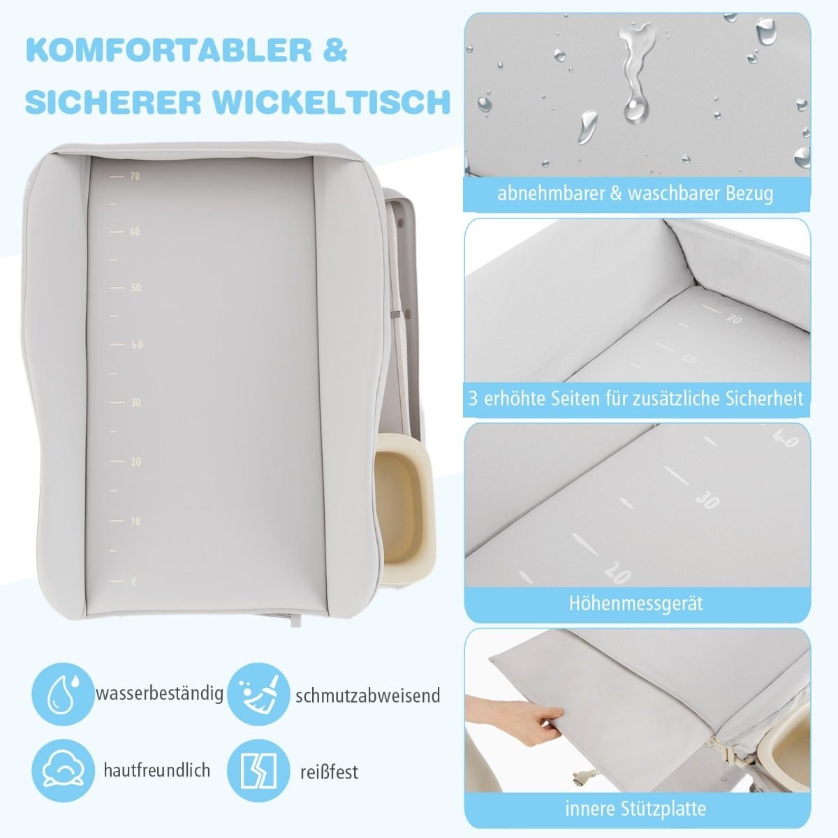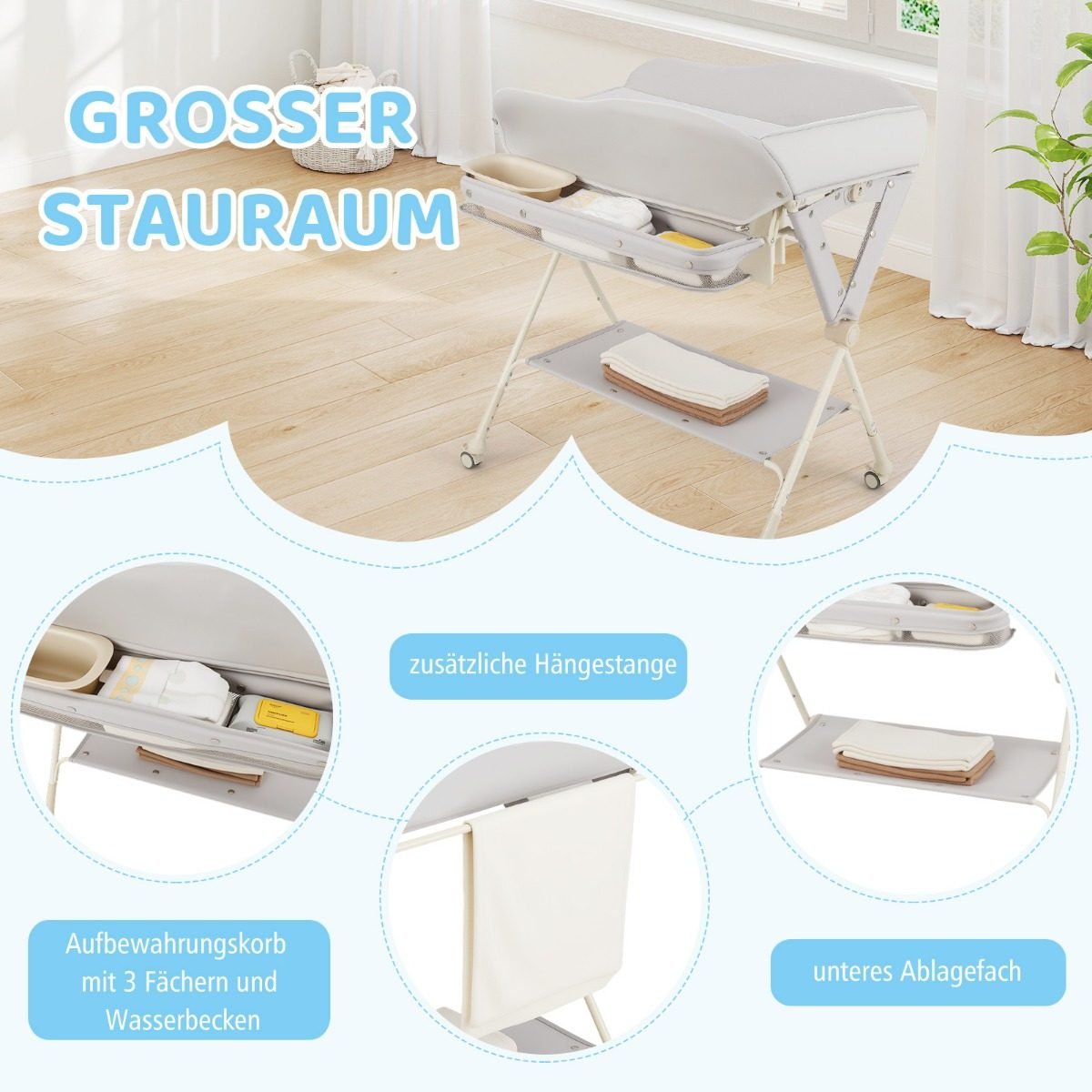 Daugiafunkcis sulankstomas vystymo stalas su laikymo krepšiu ir praustuvėliu (Pilka)