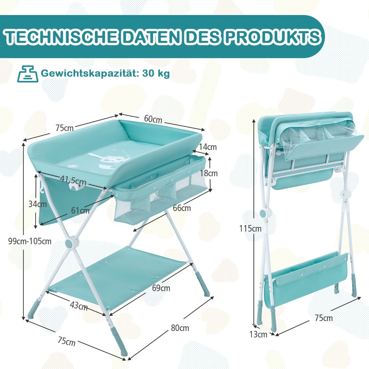 - Universali 4-in-1 funkcija: vystyklų keitimas, kūdikio prausimas, masažas, drabužių laikymas ir džiovinimas.