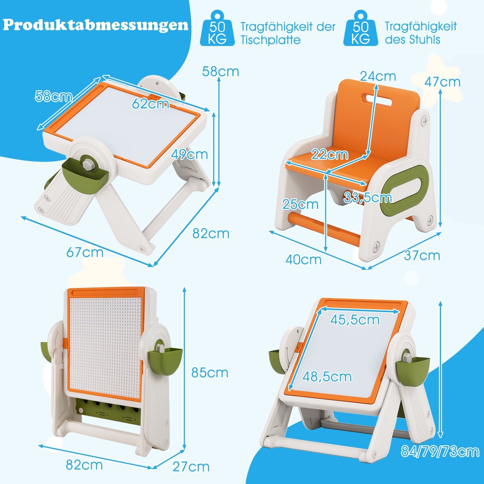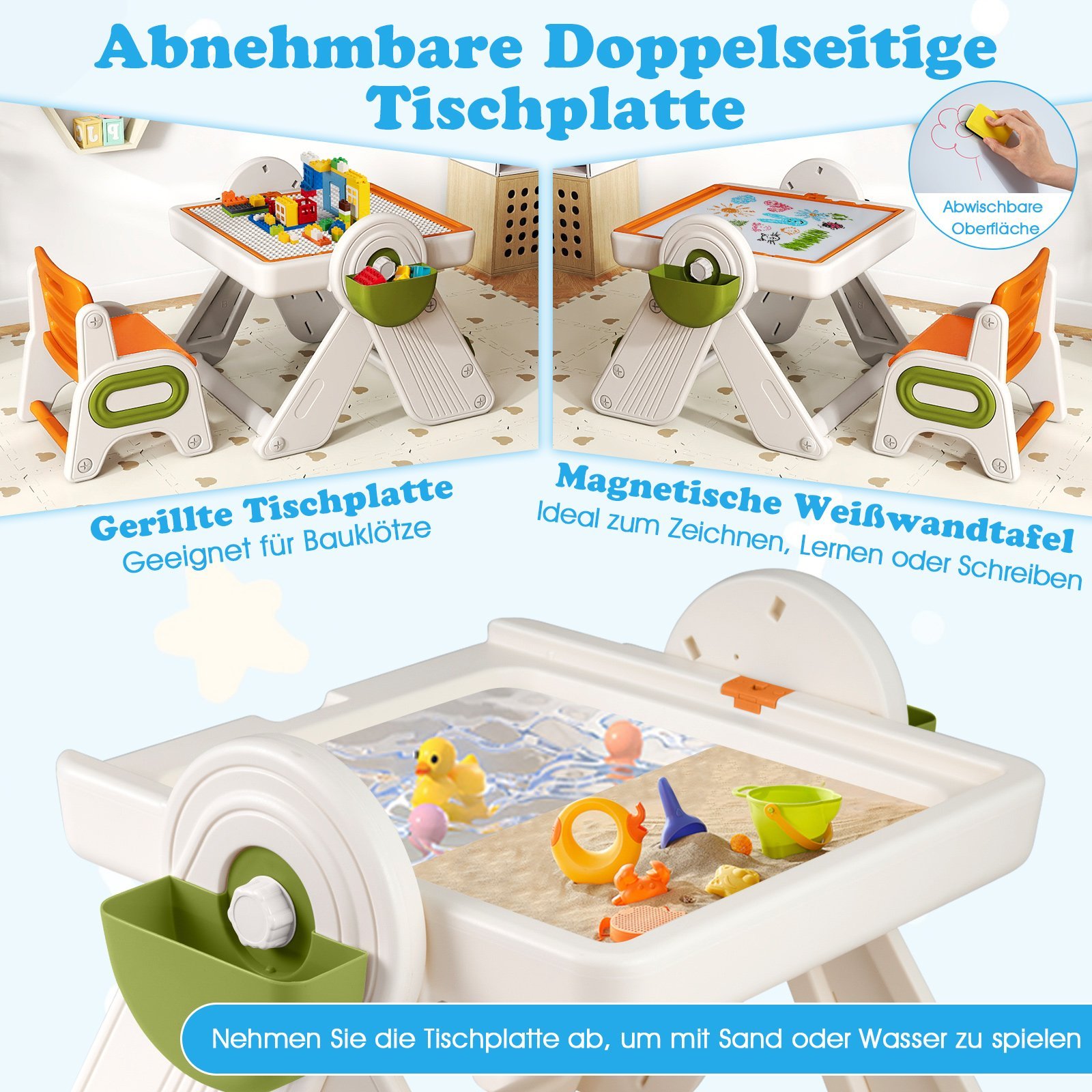 Šis 6-in-1 daugiafunkcis vaikiškas stalas, kuris lengvai transformuojasi į molbertą, turi dvipusį stalviršį su magnetine lenta piešimui ir paviršiumi kaladėlių statybai. Tai leidžia vaikams rašyti, piešti ar žaisti įvairius žaidimus. Šis universalus stalas puikiai tinka rašymui, pietums, smėlio ar vandens žaidimams, atitinkantis įvairius jūsų vaiko poreikius. Rinkinyje taip pat yra patogi kėdutė ir įmontuotos daiktų laikymo vietos žaislams bei knygoms. Visa konstrukcija pagaminta iš aukštos kokybės HDPE ir ABS medžiagų, užtikrinančių saugią žaidimo ir mokymosi aplinką.