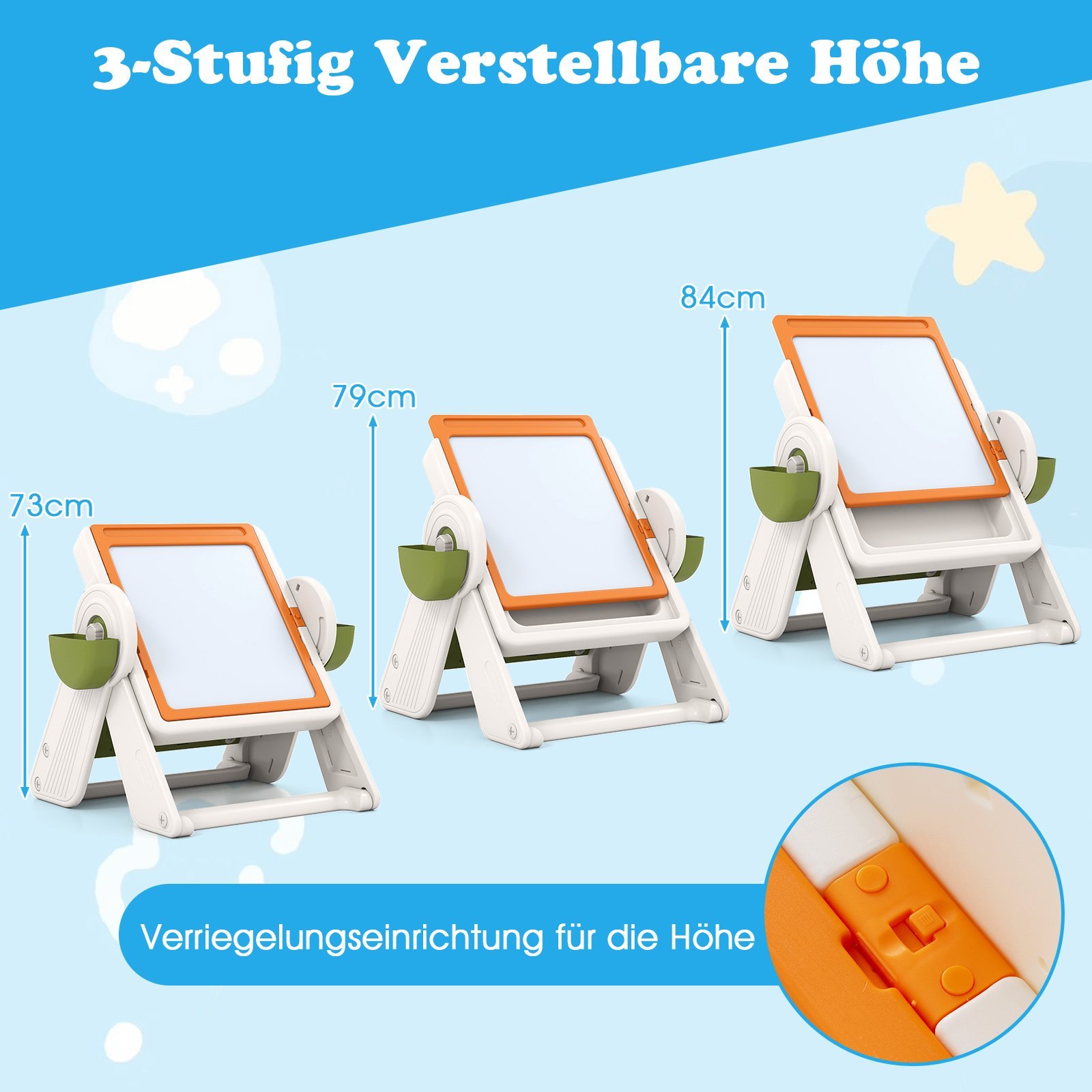 - Reguliuojamo aukščio molbertas: lengvai transformuojamas į 3 padėčių molbertą, pritaikomą piešimui sėdint ar stovint (aukštis 74-84 cm).