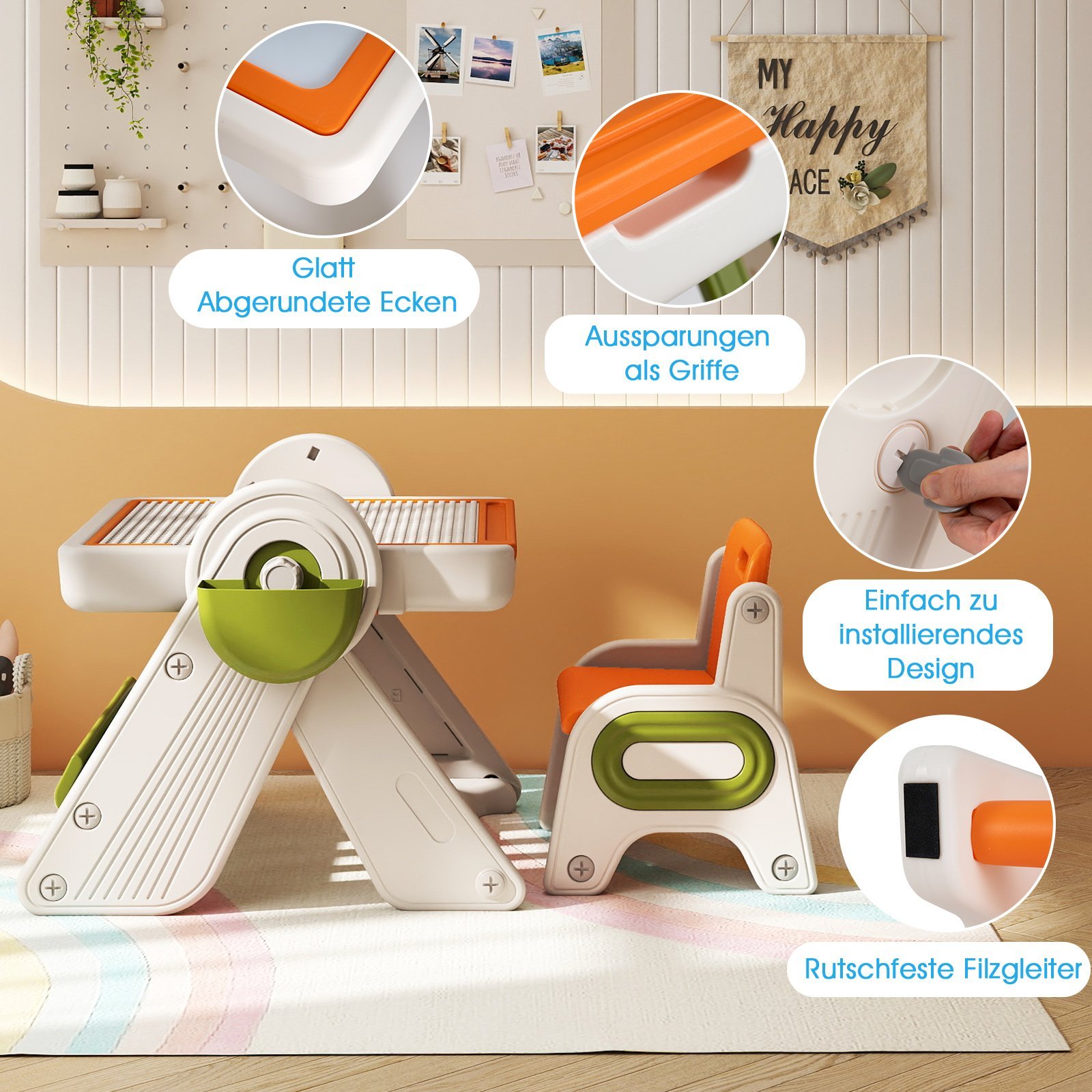 - Saugi ir vaikams pritaikyta konstrukcija: suapvalinti kampai, neslystantys kojelių antgaliai ir aukštos kokybės, vaikams saugios medžiagos (HDPE, ABS).