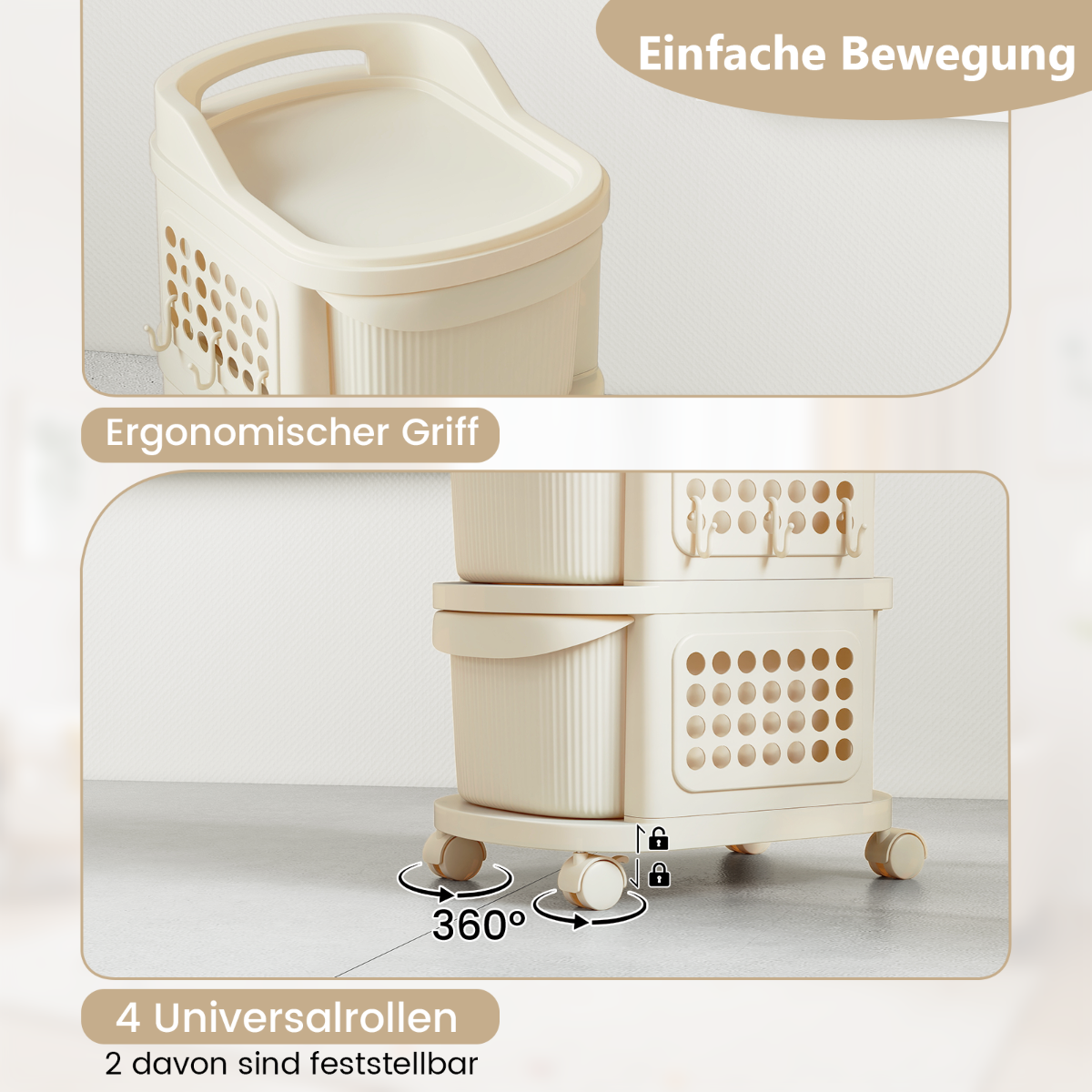 - Lengvą mobilumą užtikrina 4 universalūs ratukai (2 su fiksatoriais) ir ergonomiška rankena.
