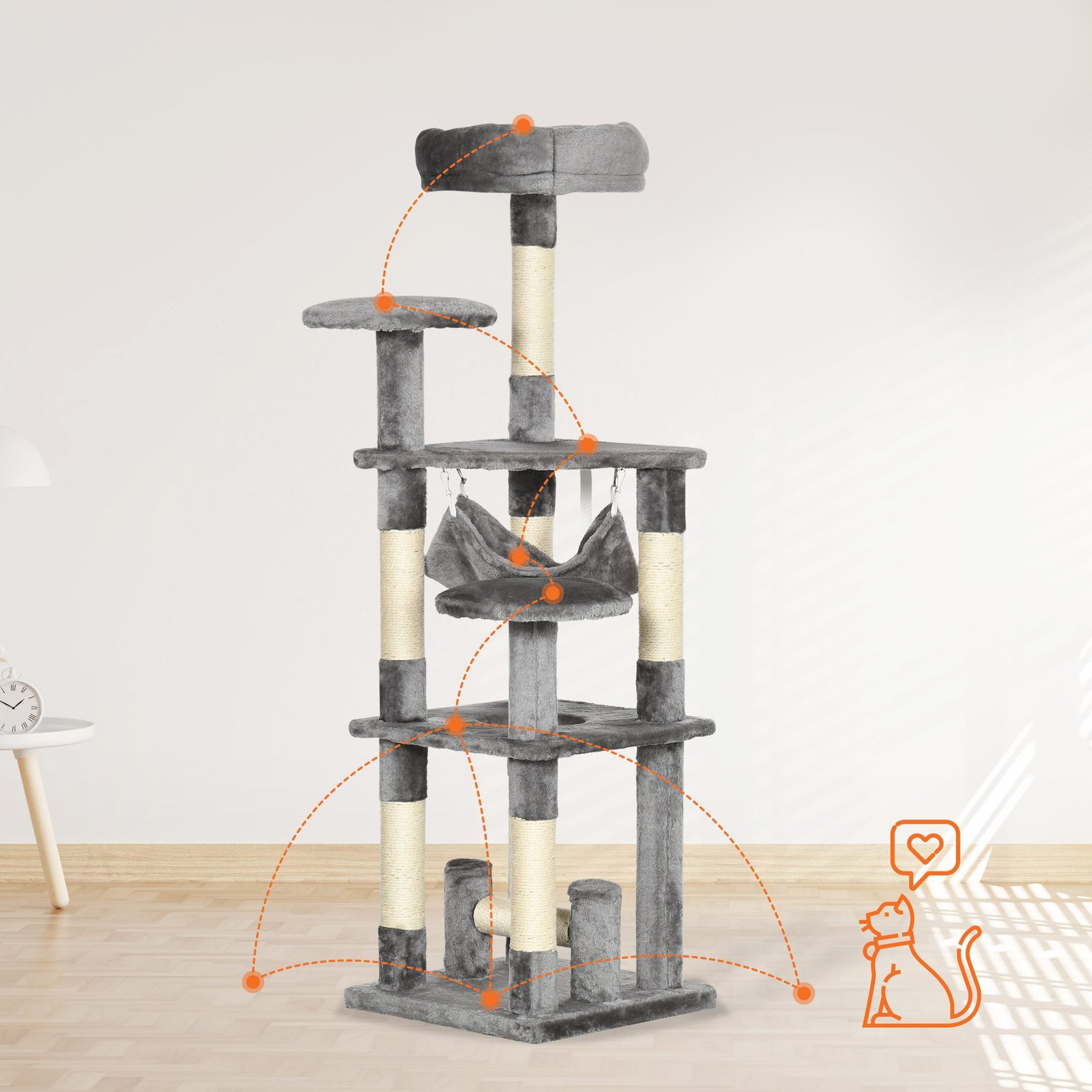 ✔ 3 apskritos platformos, 1 katės hamakas, daug draskymo elementų