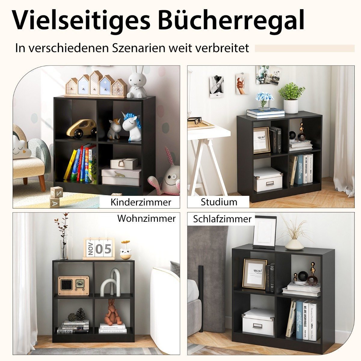 Daugiapakopis keturių skyrių lentynų stovas (Juoda)