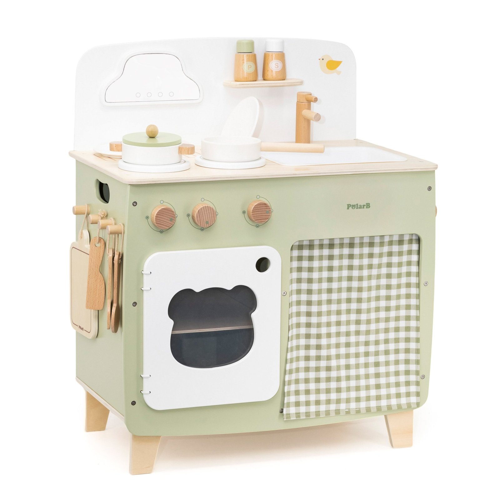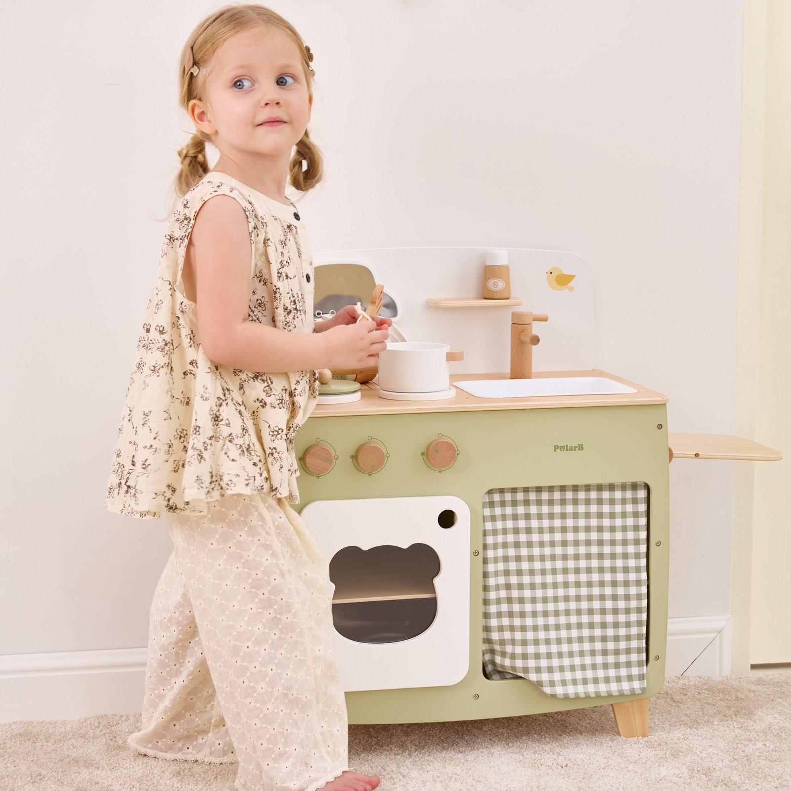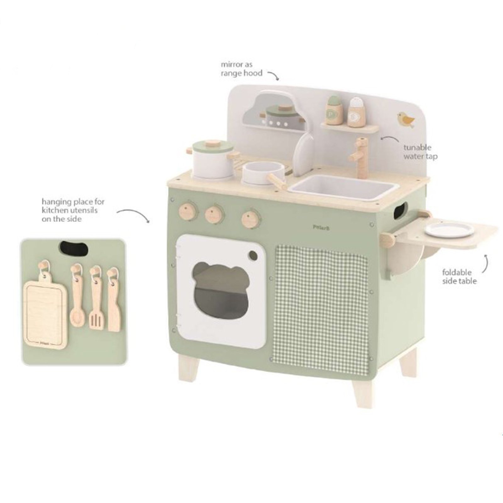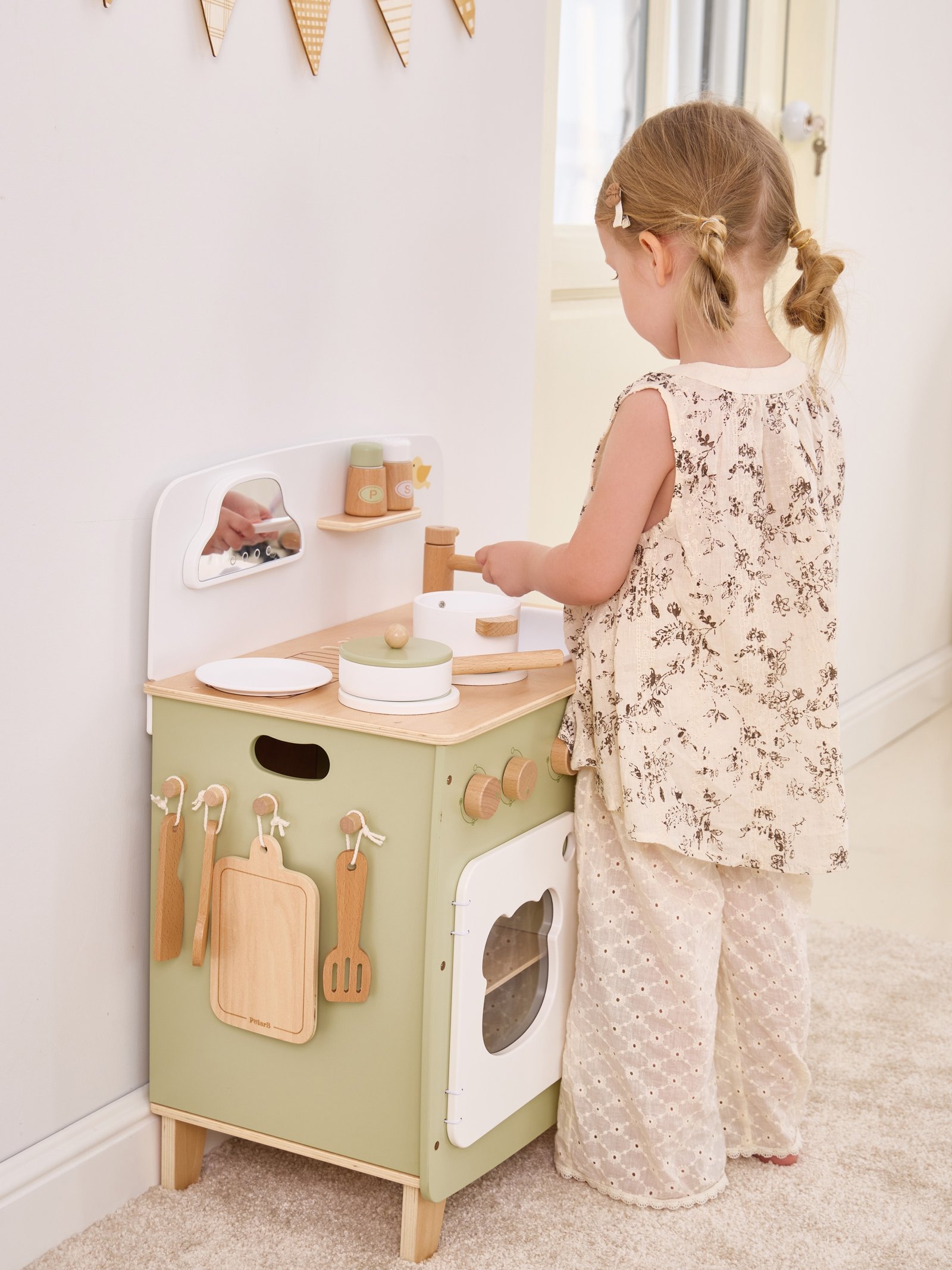 Ši medinė virtuvėlė – puikus pasirinkimas ieškantiems kokybiško ir patvaraus žaislo savo vaikui. Ji sukurta taip, kad mažylis pasijustų tikru virtuvės šefu! Veidrodinis gartraukis, viryklė ir orkaitė – tai tik dalis patogumų, kuriuos siūlo ši virtuvėlė. Žaidimas lavina vaizduotę, skatina kūrybiškumą ir moko naudotis virtuvės įrankiais.