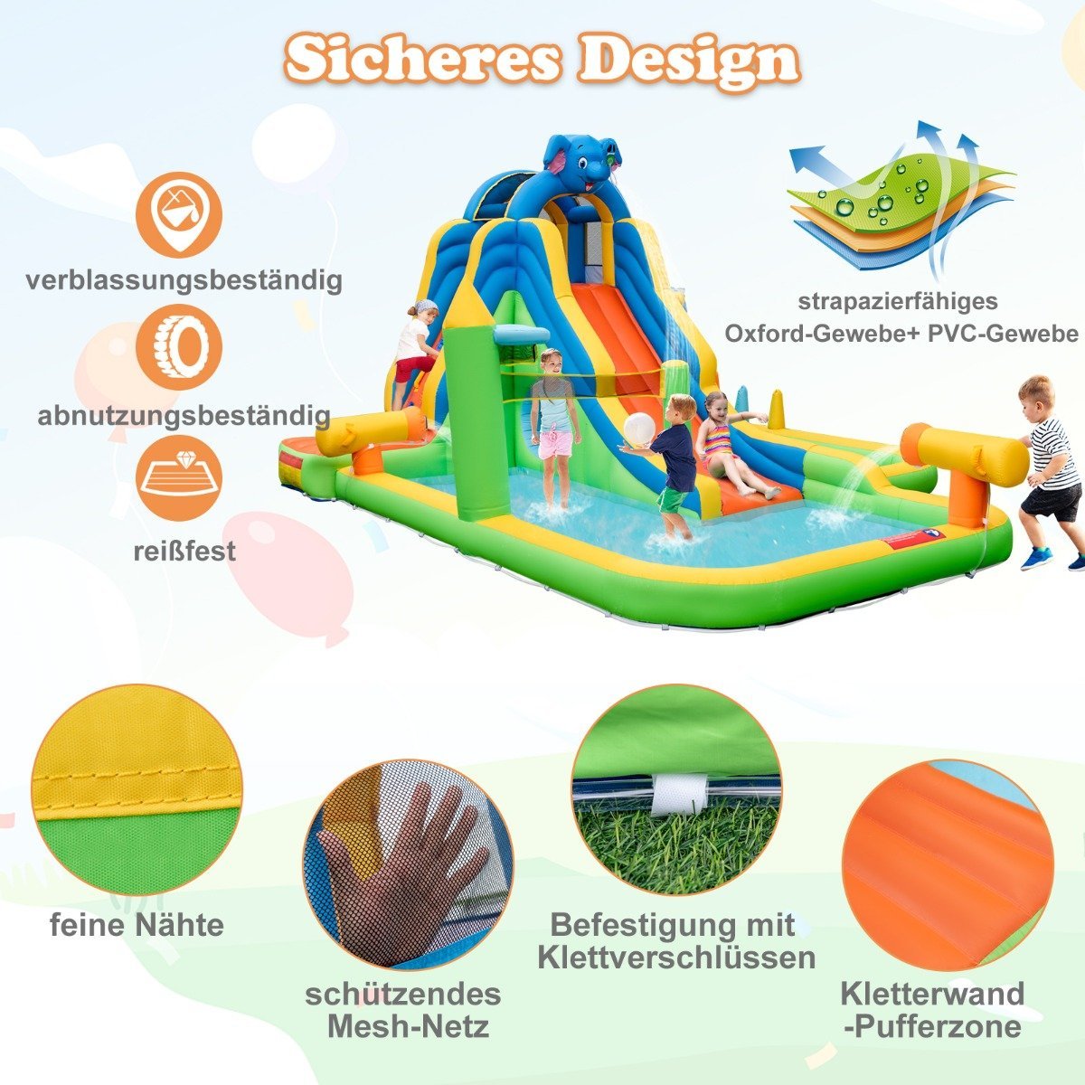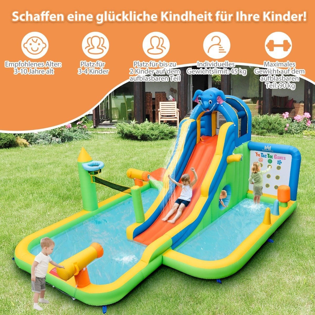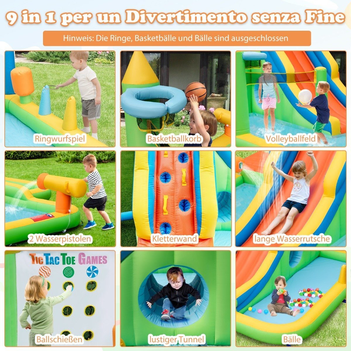 Atverkite vaikams begalinį džiaugsmą su mūsų nauja didžiule pripučiama vandens čiuožykla! Šis 9-in-1 vandens parkas siūlo daugybę pramogų, skatinančių fizinę raidą ir socialinę sąveiką, užtikrinant ištisas valandas smagaus žaidimo ir nuotykių.