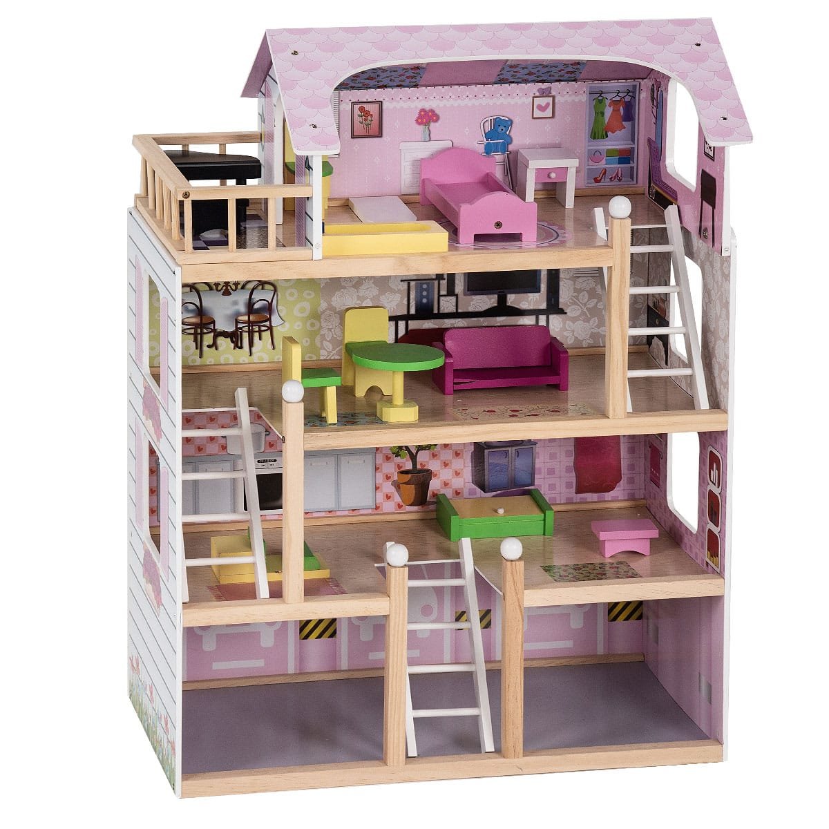 Didelis 4 aukštų medinis lėlių namelis su baldais (Rožinė)