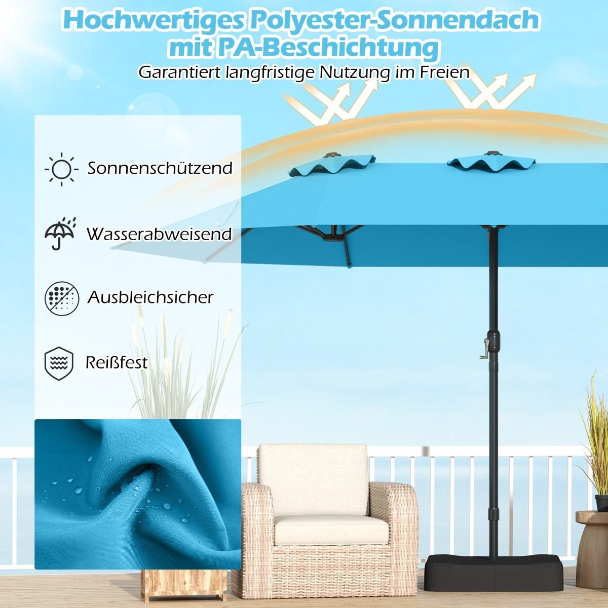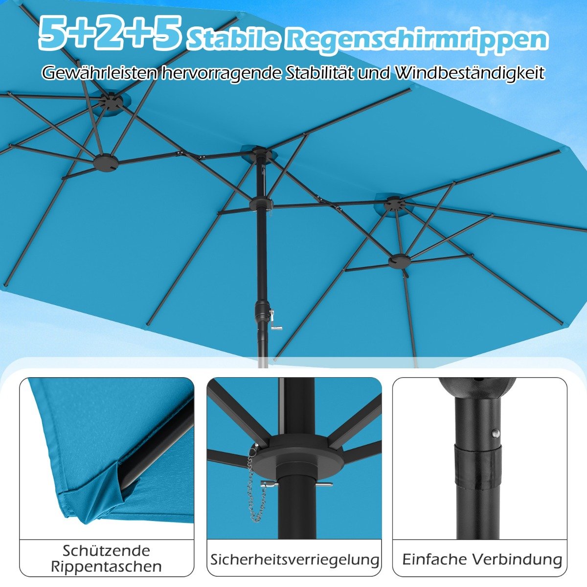 Užtikrinkite vėsesnę ir patogesnę lauko patirtį su mūsų dideliu dvipusiu skėčiu nuo saulės. Jis puikiai tinka įvairioms progoms – nuo sodo vakarėlių iki poilsio prie baseino, suteikdamas plačią pavėsio zoną.