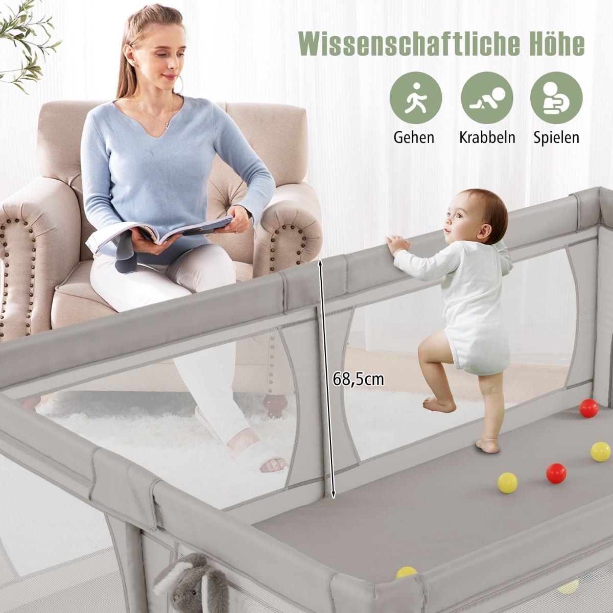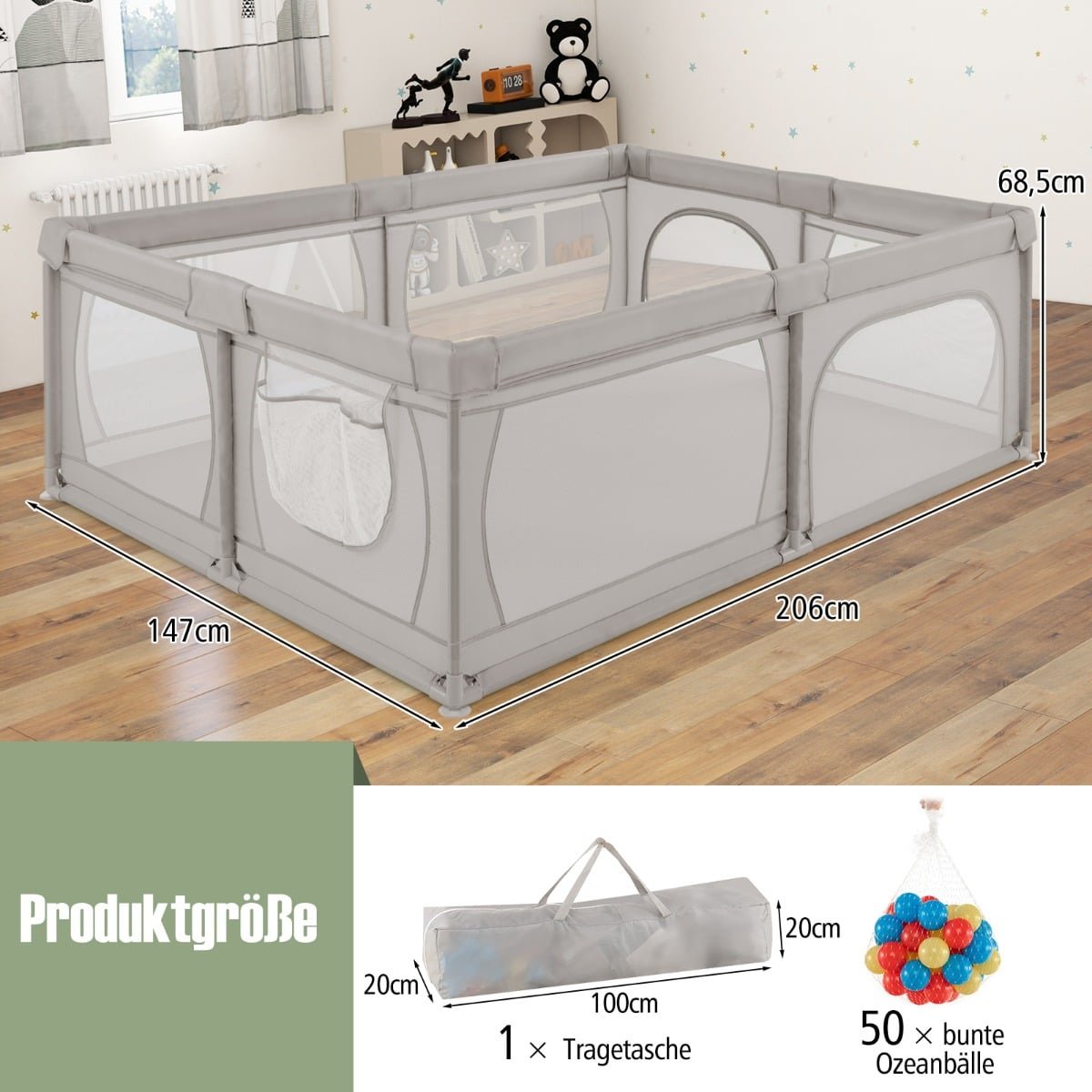 Didelis kūdikių maniežas su 50 kamuoliukų ir kvėpuojančiu tinkleliu (Pilka)