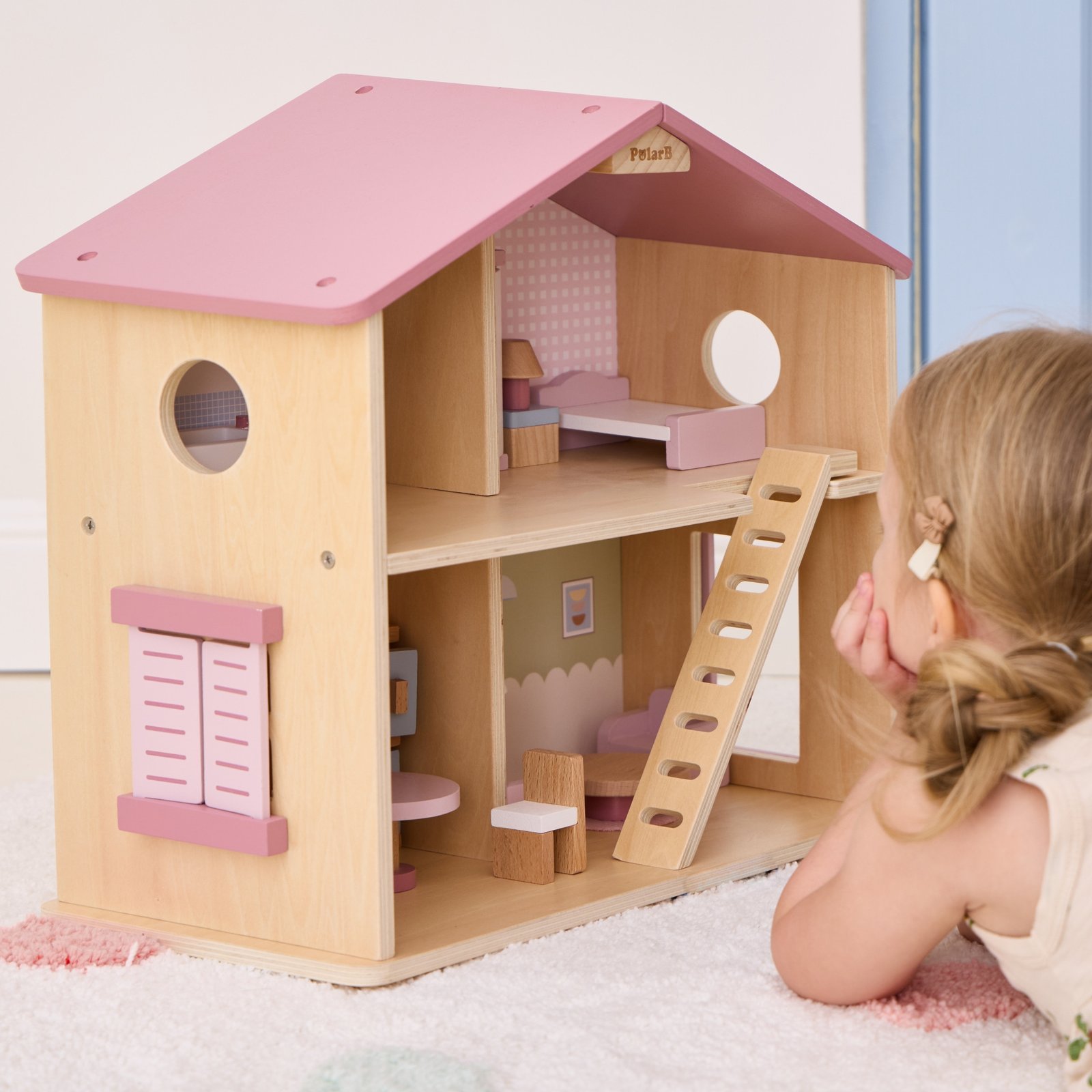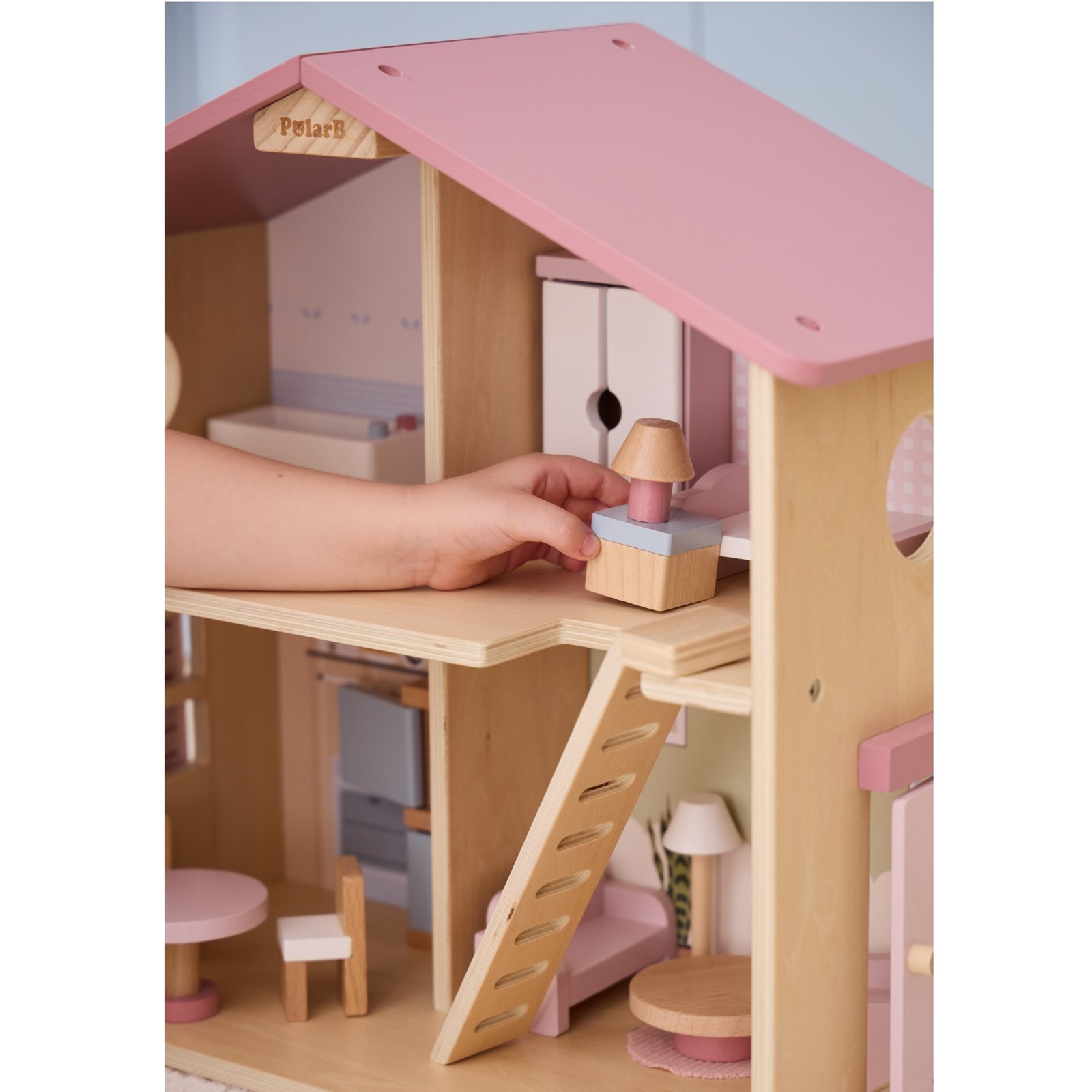 Didelis medinis „Viga PolarB“ serijos lėlių namelis yra aukštos kokybės žaislas, pagamintas iš natūralios medienos ir nudažytas švelniomis pastelinėmis spalvomis.