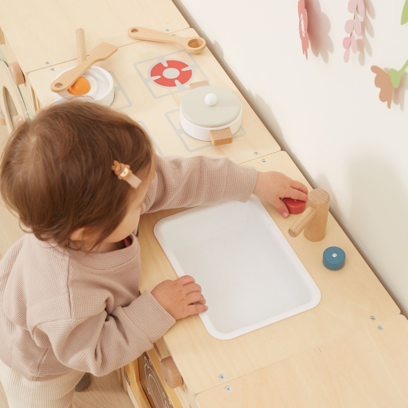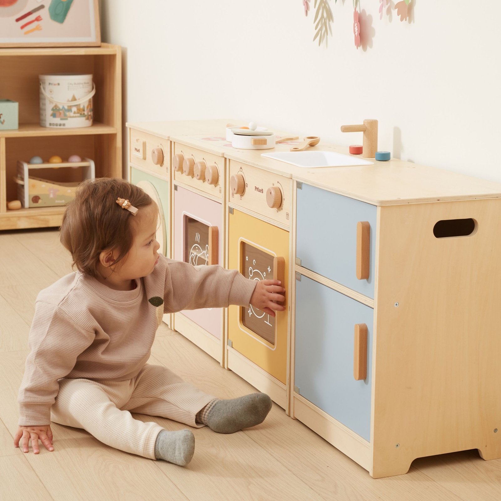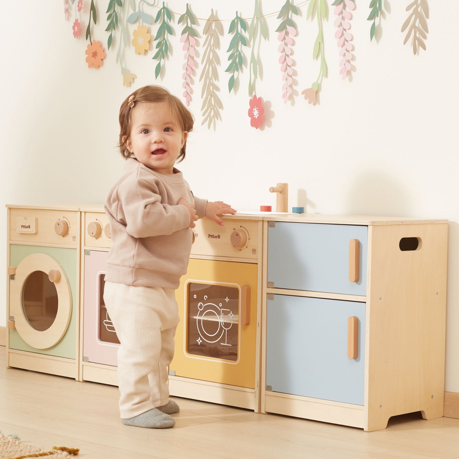 Tvirtos rankenėlės leidžia lengvai atidaryti ir uždaryti dureles, o sukiojami jungikliai skleidžia realistišką spragtelėjimo garsą. Pastelinės spalvos patraukia vaiko dėmesį ir puikiai dera prie kambario interjero. Rinkinys yra visiškai saugus mažiesiems – neturi aštrių briaunų ar kampų.