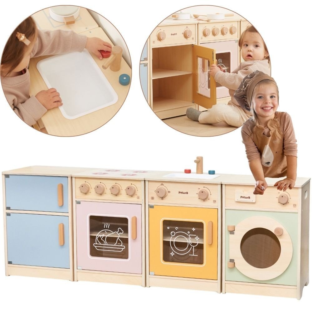 Medinis virtuvės rinkinys, sukurtas specialiai mažyliams, suteiks vaikui daug džiaugsmo ir įdomių žaidimo akimirkų. Rinkinį sudaro šaldytuvas, viryklė su orkaite, kriauklė, indaplovė ir skalbimo mašina.