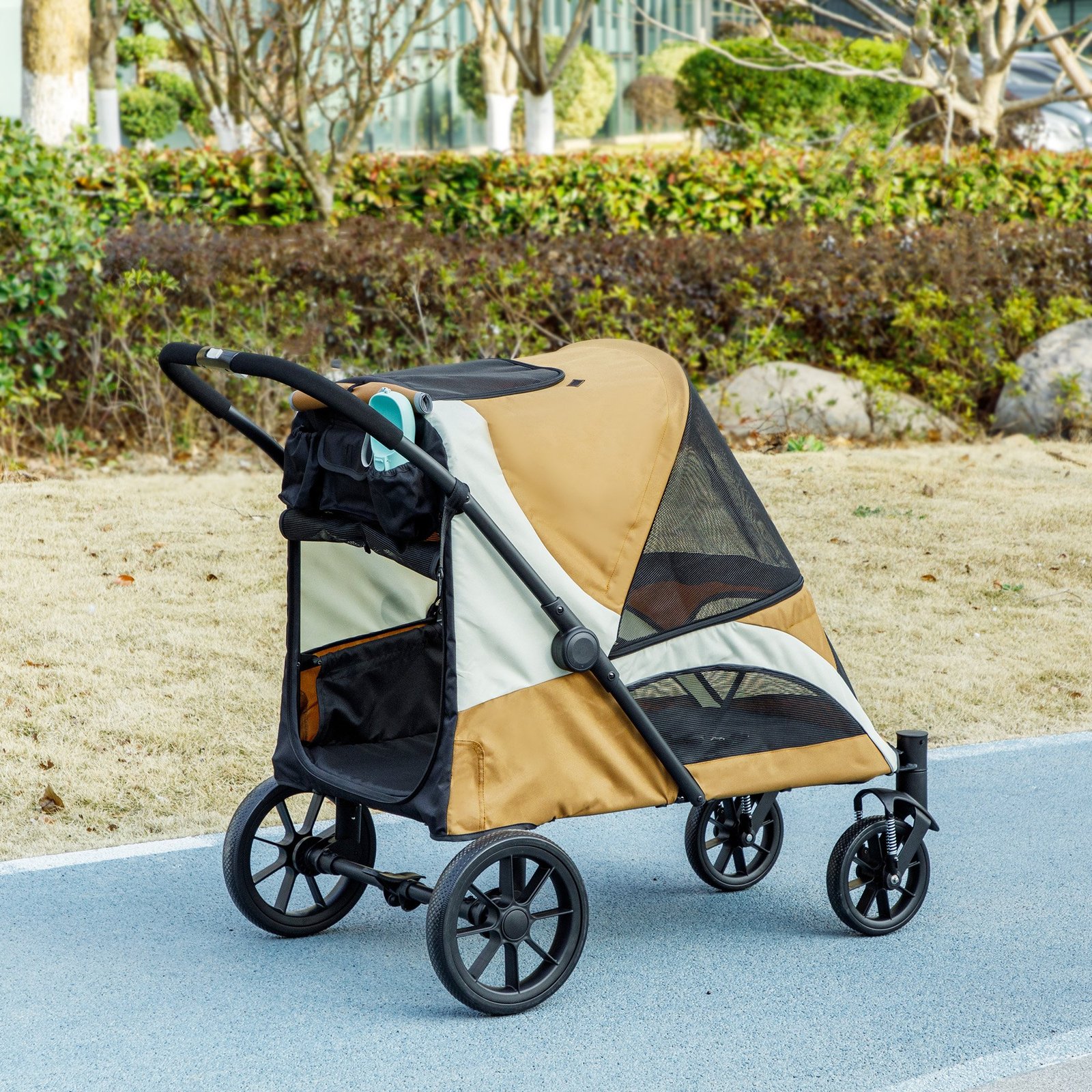 Atraskite gamtą patogiai su savo keturkoju draugu, dėka šio vežimėlio šunims iki 30 kg. Specialiai sukurtas dideliems šunims, jis talpina augintinius iki 30 kg ir 68 cm ūgio. Lengvai sulankstomas vežimėlis šunims su nuimamais ratais padaro laikymą ir transportavimą itin paprastą. Dideli, smūgius sugeriantys vežimėlio ratai užtikrina sklandų važiavimą, o daugybė tinklinių langų ir du įėjimai suteikia gražų vaizdą bei komfortą jūsų keturkojui draugui.