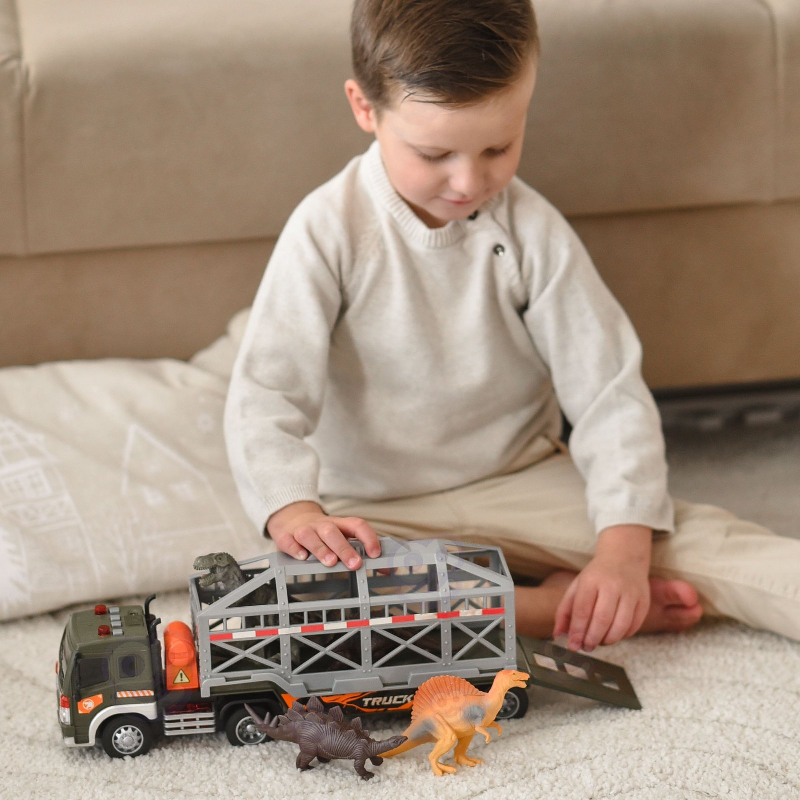 Dinozaurų sunkvežimis su figūrėlėmis, garsais ir šviesomis