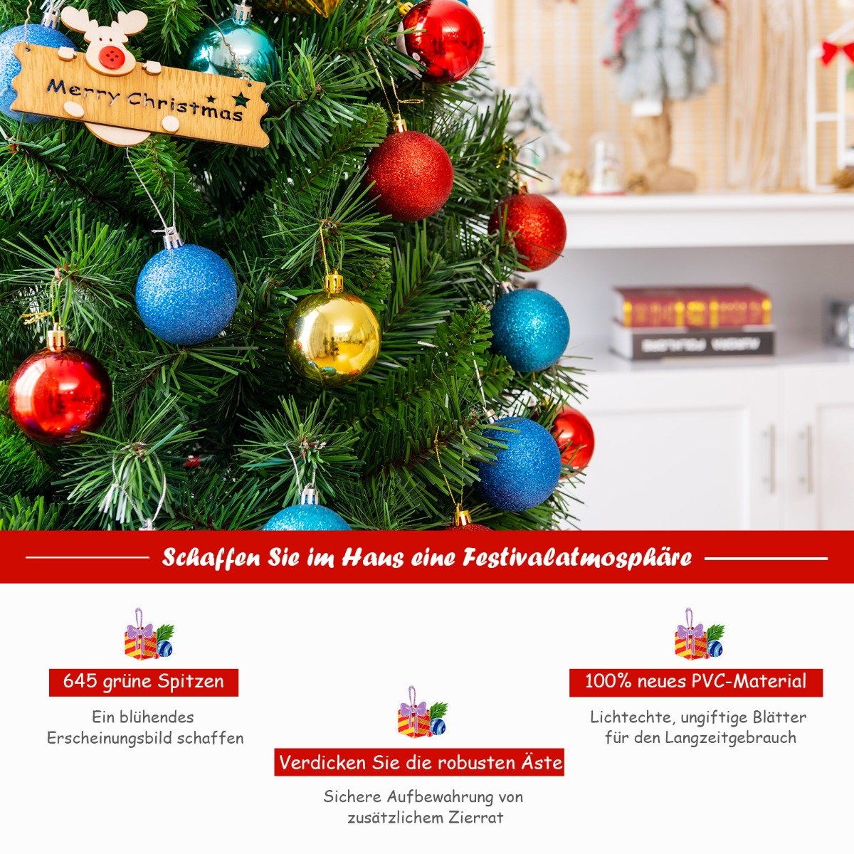 Sukurkite nepamirštamą šventinę atmosferą su šia puošnia, 180 cm aukščio dirbtine Kalėdų eglute. Pagaminta iš aukštos kokybės PVC medžiagos, ji atrodo itin natūraliai ir suteikia jaukumo jūsų namams. Tobulai tiks šventiniam laikotarpiui papuošti!
