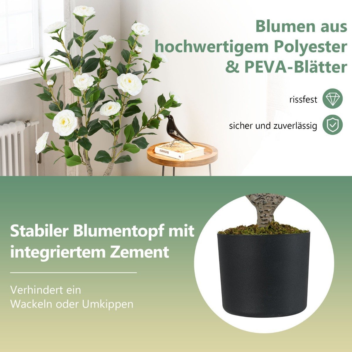 Atgaivinkite savo namų ar biuro interjerą su šia ilgaamže dirbtine kamelija. Kruopščiai sukurtas augalas, pasižymintis itin tikroviškais žiedais ir lapais, suteiks natūralaus grožio be jokių pastangų. Idealiai tinka tiems, kurie vertina estetiką ir praktiškumą.