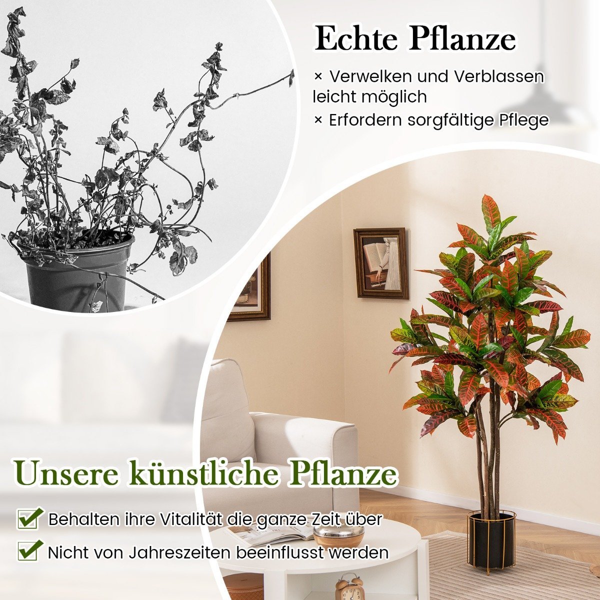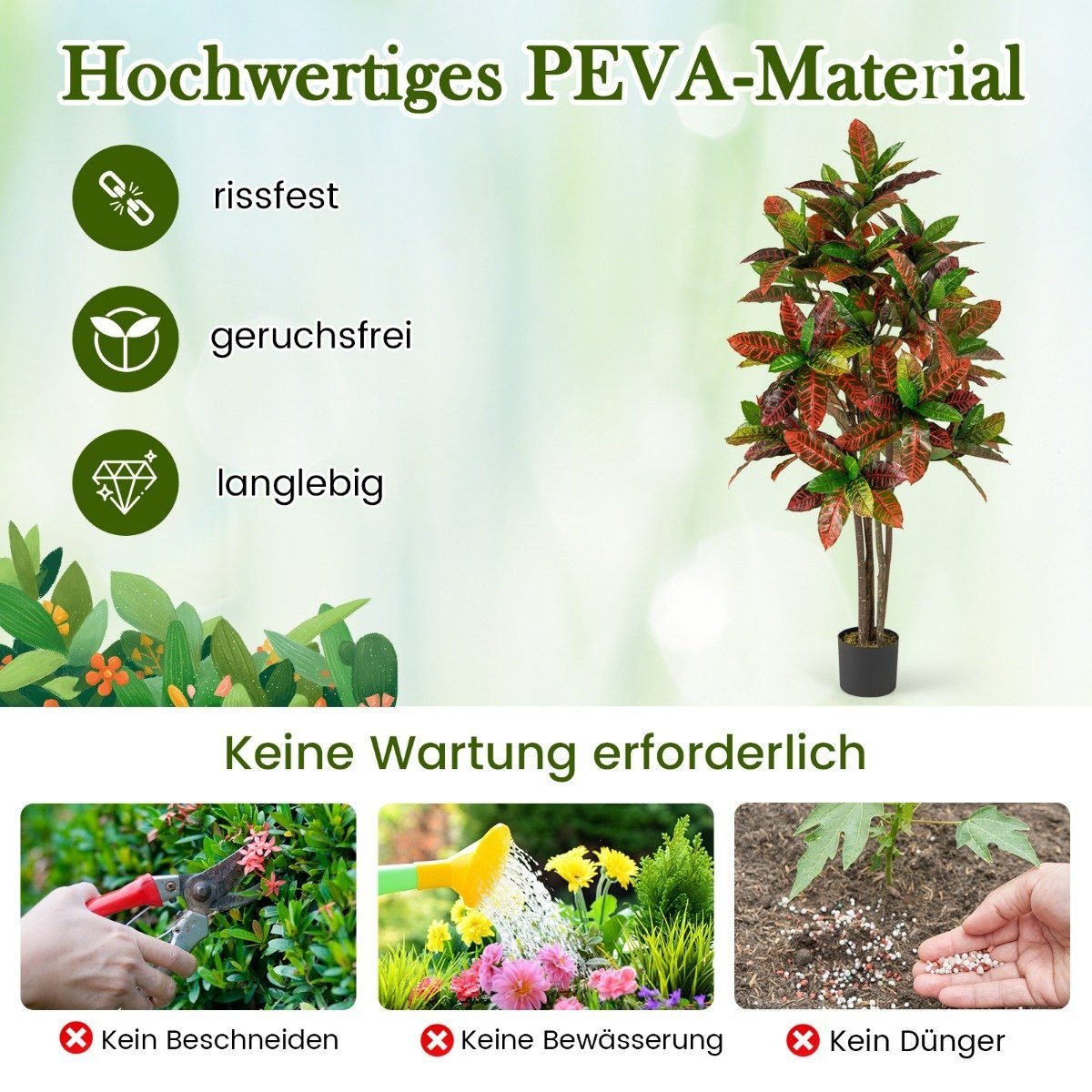 Atnaujinkite savo namus gamtos dvelksmu su šiuo stulbinančiu dirbtiniu Krotonų medžiu. Jo 150 cm aukštis ir ryškūs, spalvingi lapai jūsų erdvei suteiks elegancijos ir gyvybingumo. Pagamintas iš aukštos kokybės medžiagų, šis medis nereikalauja jokios priežiūros, taip taupydamas jūsų brangų laiką.