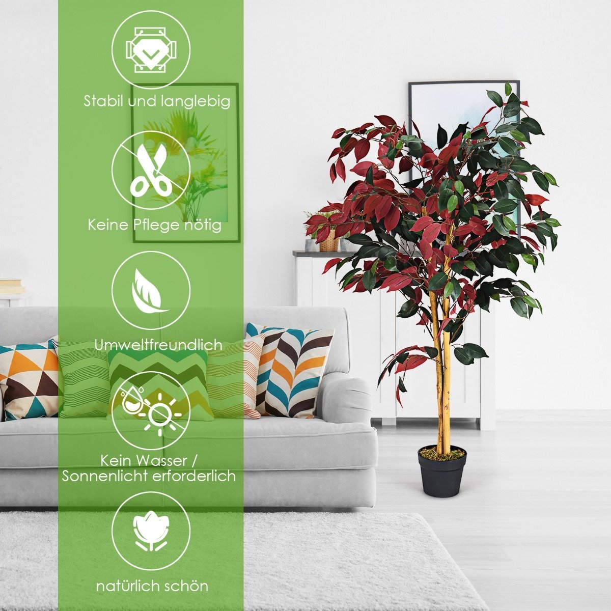 Atgaivinkite savo namų ar biuro erdvę su šiuo itin natūraliai atrodančiu dirbtiniu fikusų medeliu. Jis sukurtas taip, kad atrodytų nepaprastai realistiškai, suteikdamas bet kuriai patalpai gyvumo ir žalumo pojūtį visiškai be jokios priežiūros.