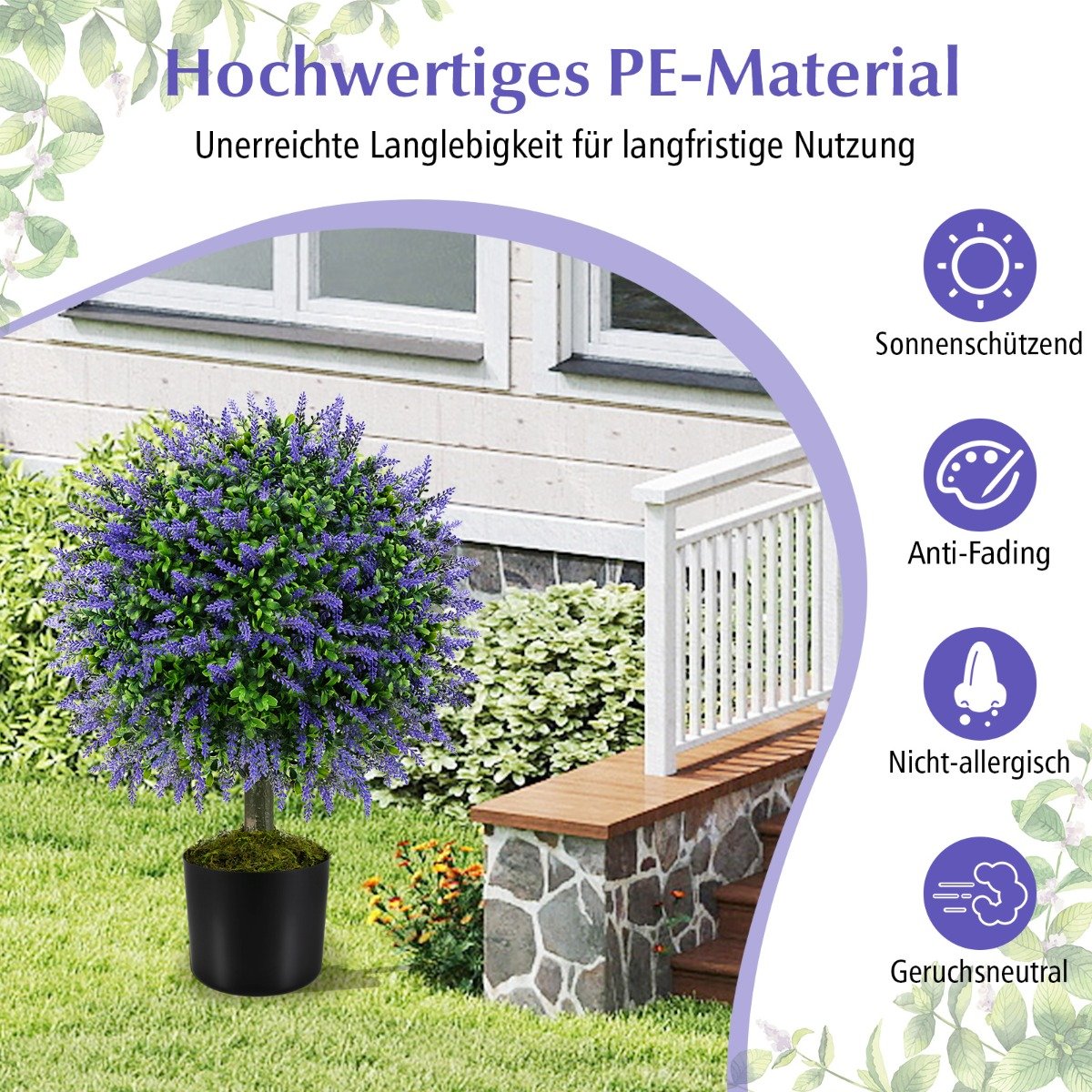 - Labai realistiškas dizainas su gausiais, daugiasluoksniais lapais ir ryškiais levandų žiedais.