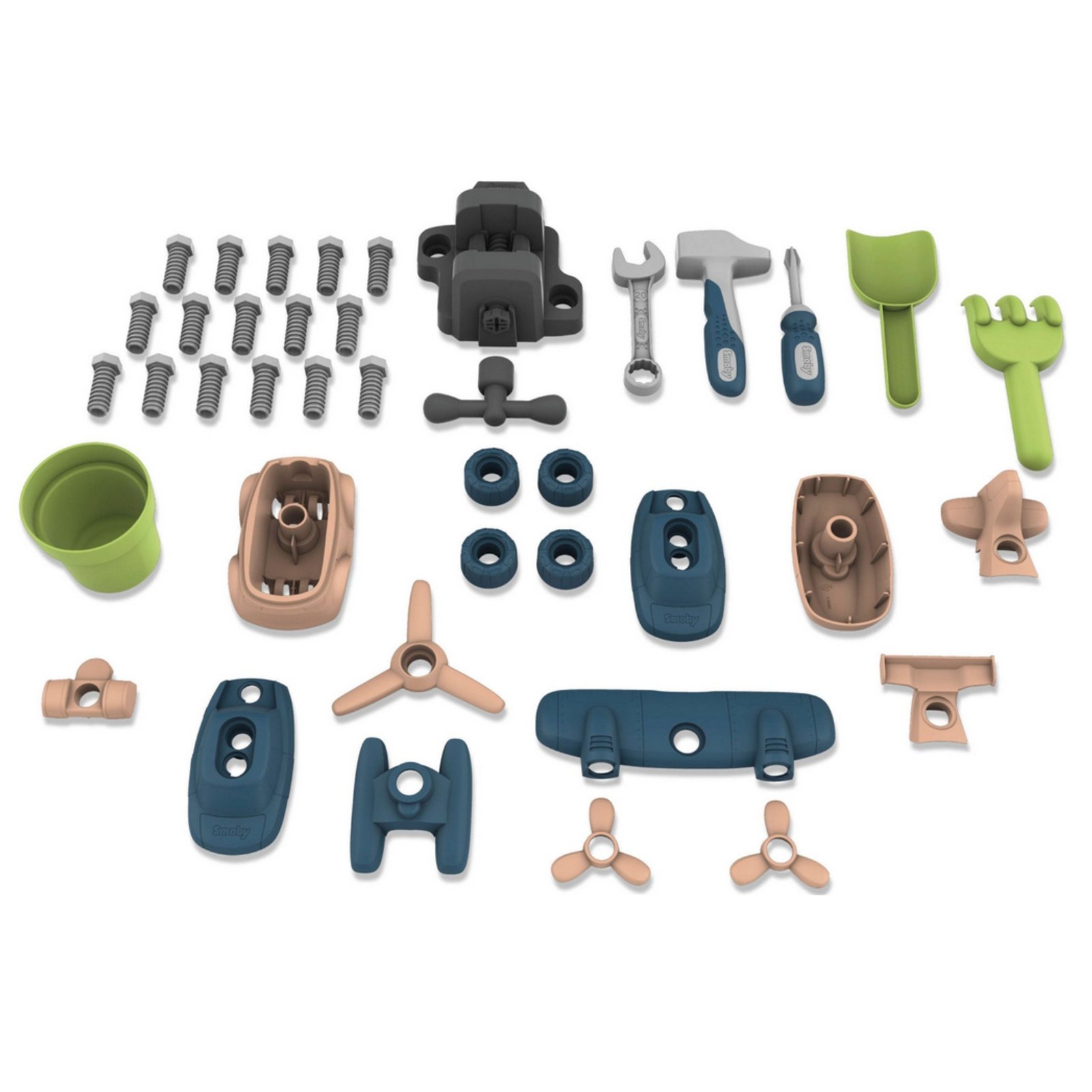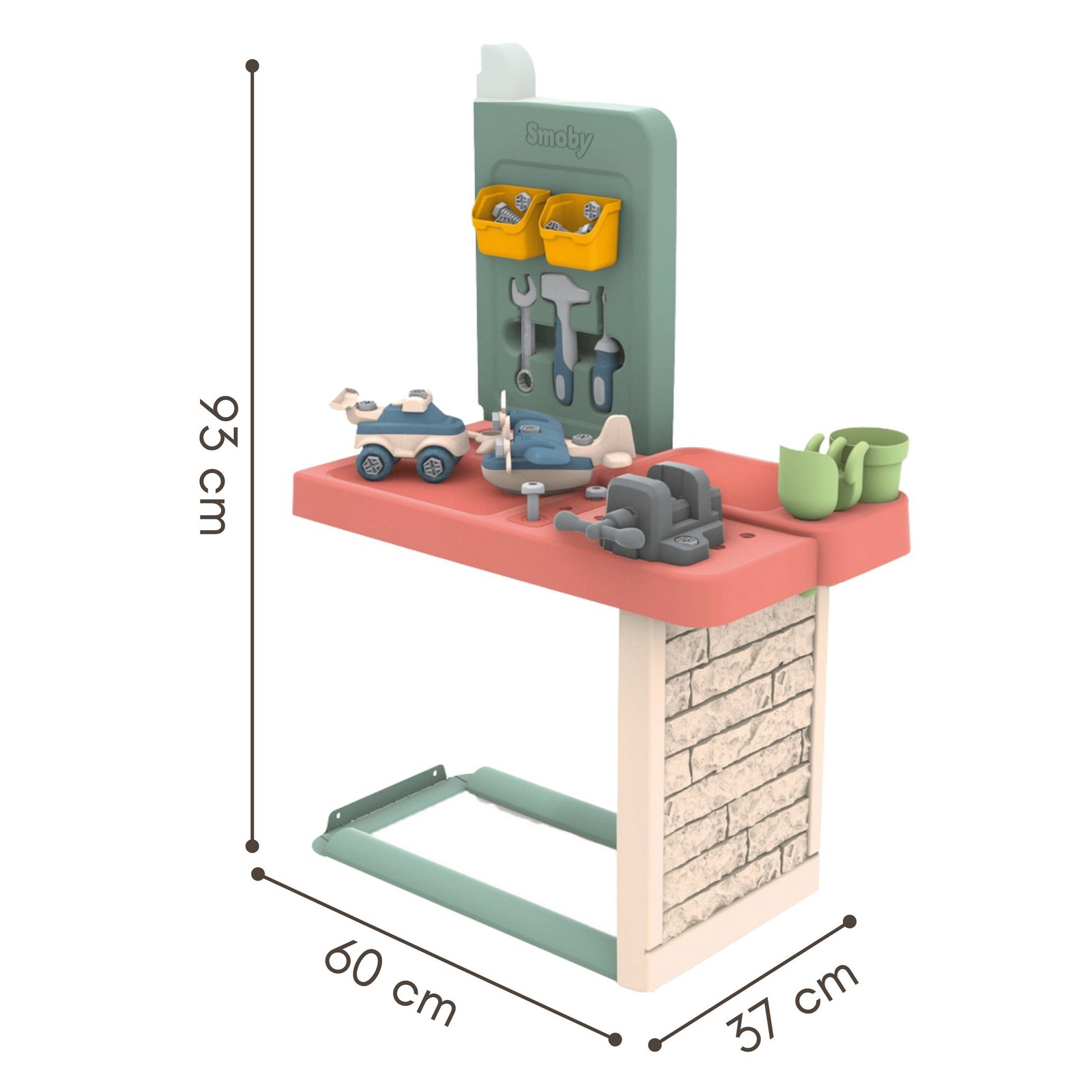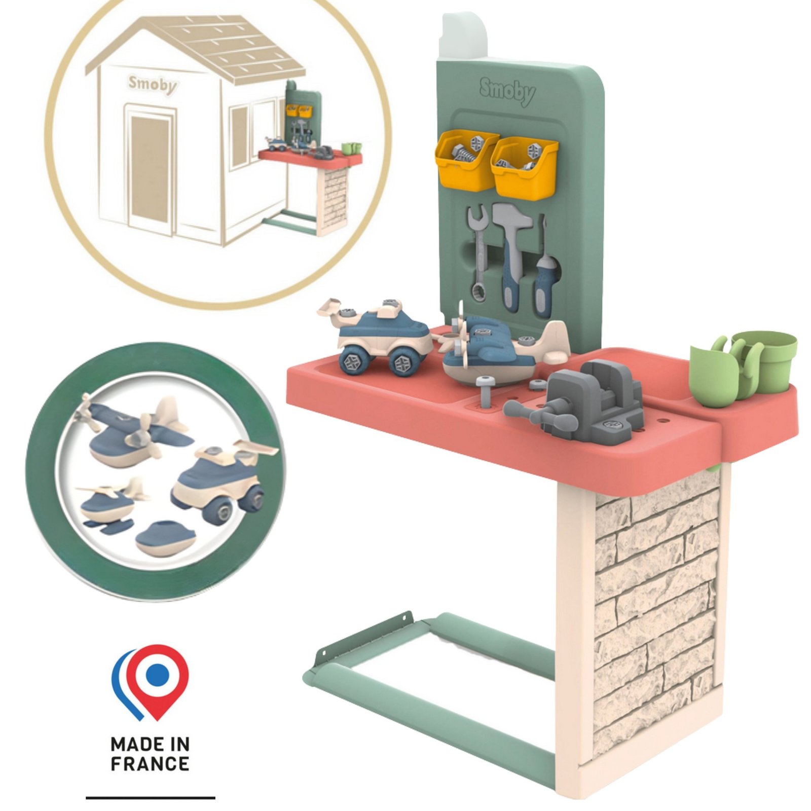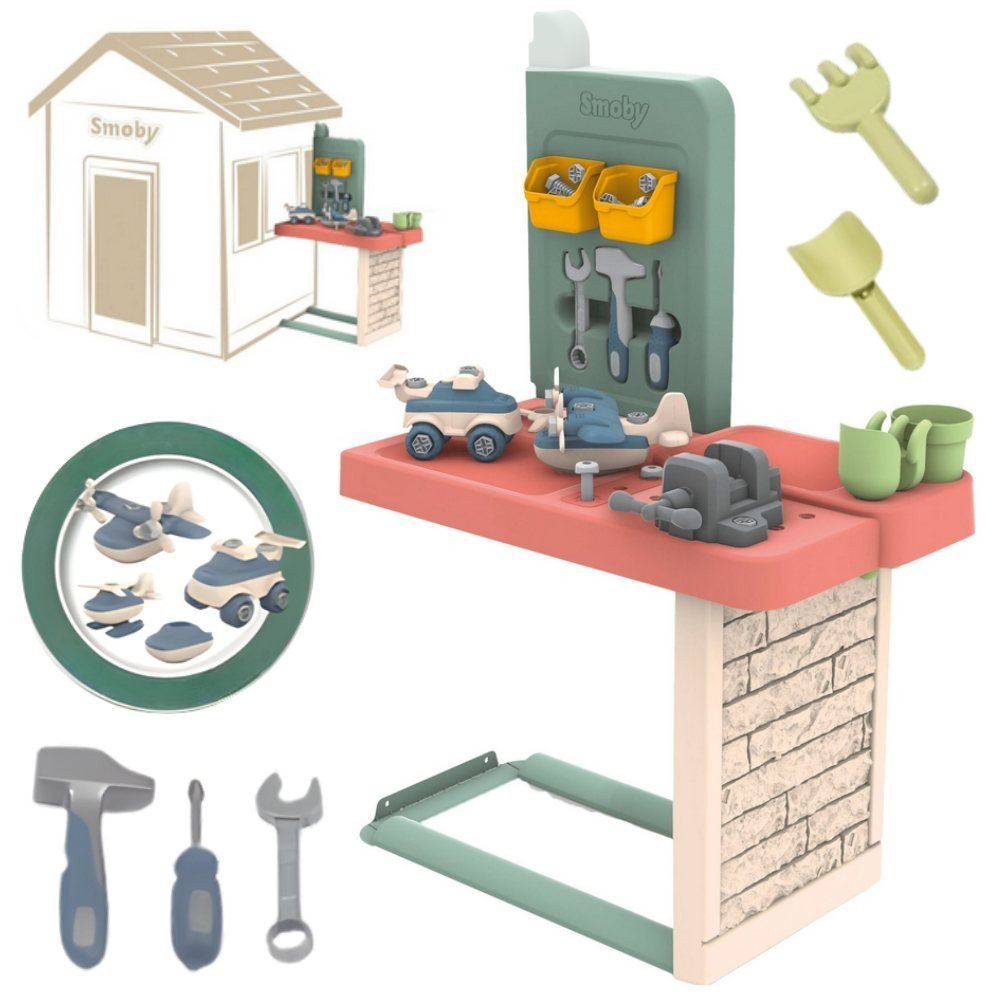 Šis darbo stalas su priedais pavers Smoby Life žaidimų namelį tikromis sodo dirbtuvėmis. Nuo 2 metų amžiaus vaikai galės drąsiai „meistrauti“, lavinti smulkiąją motoriką ir naujus rankų įgūdžius. Rinkinį sudaro 39 įrankiai, įskaitant plaktuką ar atsuktuvėlį, tad linksmybės bus garantuotos. Erdvus darbo paviršius ir patogios lentynėlės padės palaikyti tvarką ir lengvai susidėti įrankius. Komplekte rasite ir surenkamų žaislų, pavyzdžiui, automobilį ir sraigtasparnį, kurie dar labiau skatins kūrybiškumą ir strateginį mąstymą. Tvirta, UV spinduliams atspari konstrukcija, pagaminta iš perdirbtų medžiagų, užtikrina ilgaamžiškumą ir džiugias pramogas lauke daugelį metų.