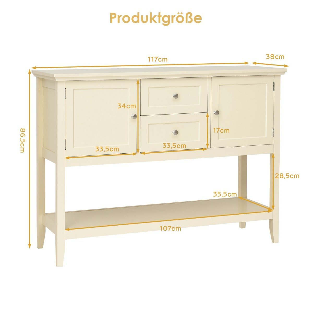 - Bendri matmenys: 117 cm x 38 cm x 86,5 cm (I x P x A)
