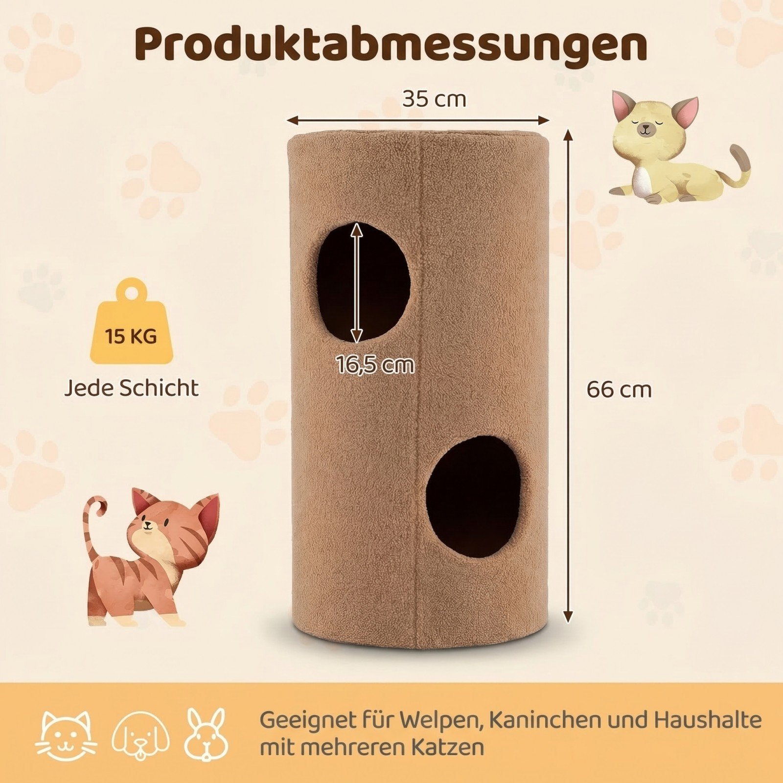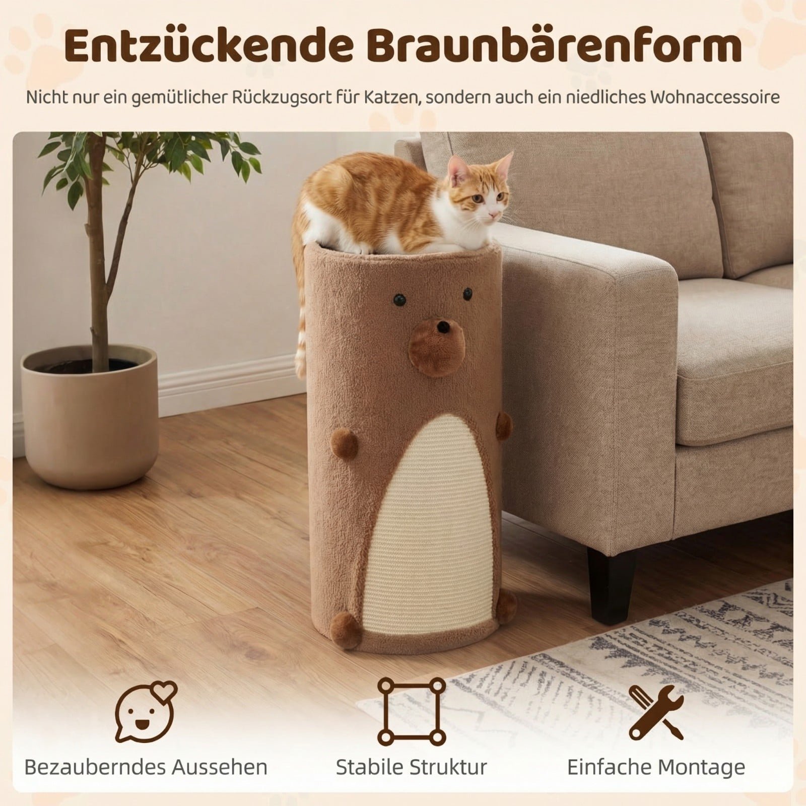 Šis žavingas, meškos formos dviaukštis namelis katėms kruopščiai pagamintas iš aukštos kokybės medienos plokštės, užtikrinančios stabilumą ir saugumą Jūsų augintiniui. Kiekvienas namelio aukštas atlaiko iki 15 kg svorį. Minkštas pliušinis audinys ir integruota sizalio draskyklė užtikrina komfortą ir padeda patenkinti natūralius kačių draskymosi instinktus.