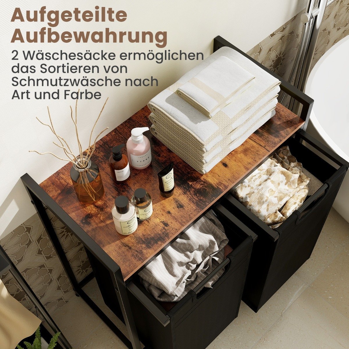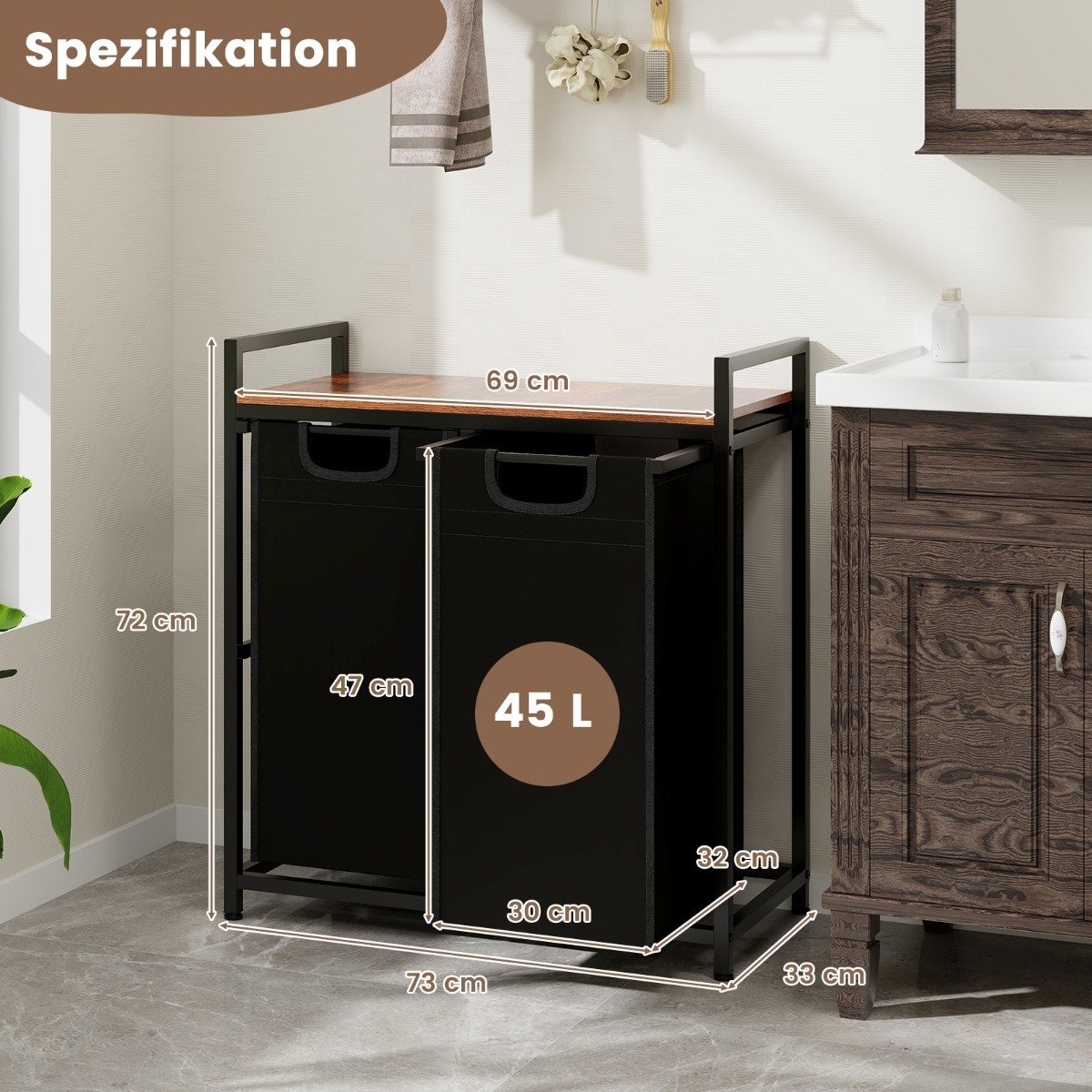 Palengvinkite skalbimo procesą su mūsų universaliu ir funkcionaliu skalbinių krepšiu. Šis ištraukiamas, dviejų skyrių krepšys su viršutine lentyna leis patogiai rūšiuoti drabužius ir laikyti skalbimo reikmenis po ranka.