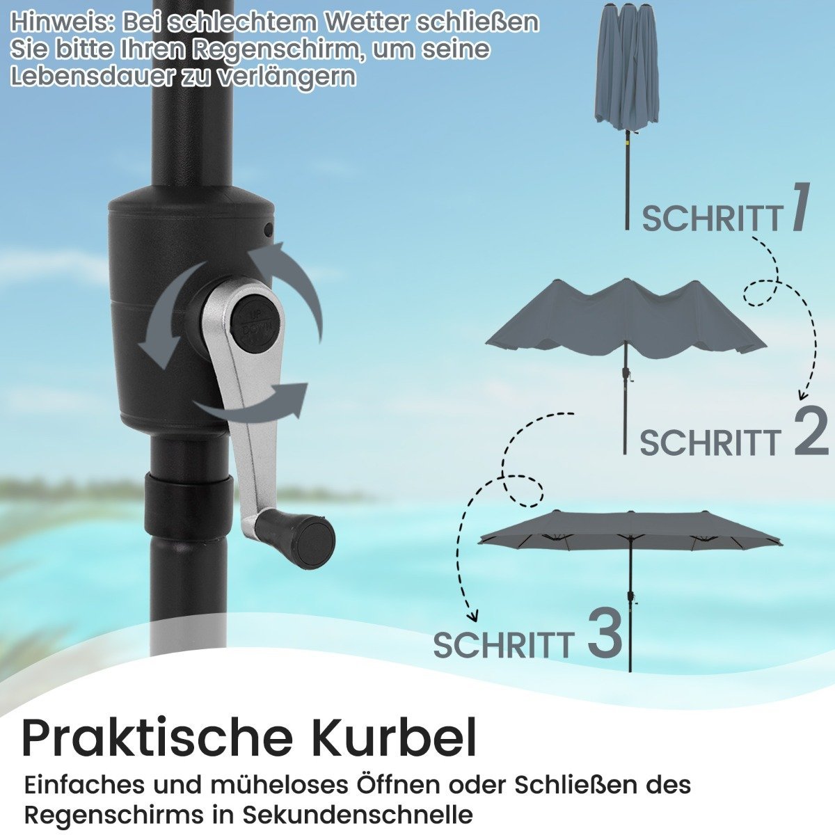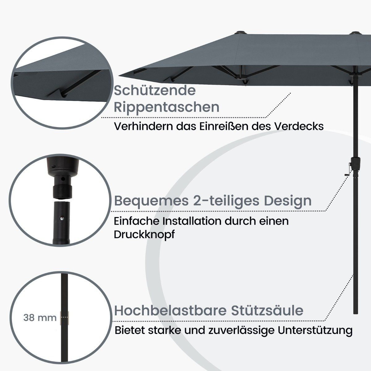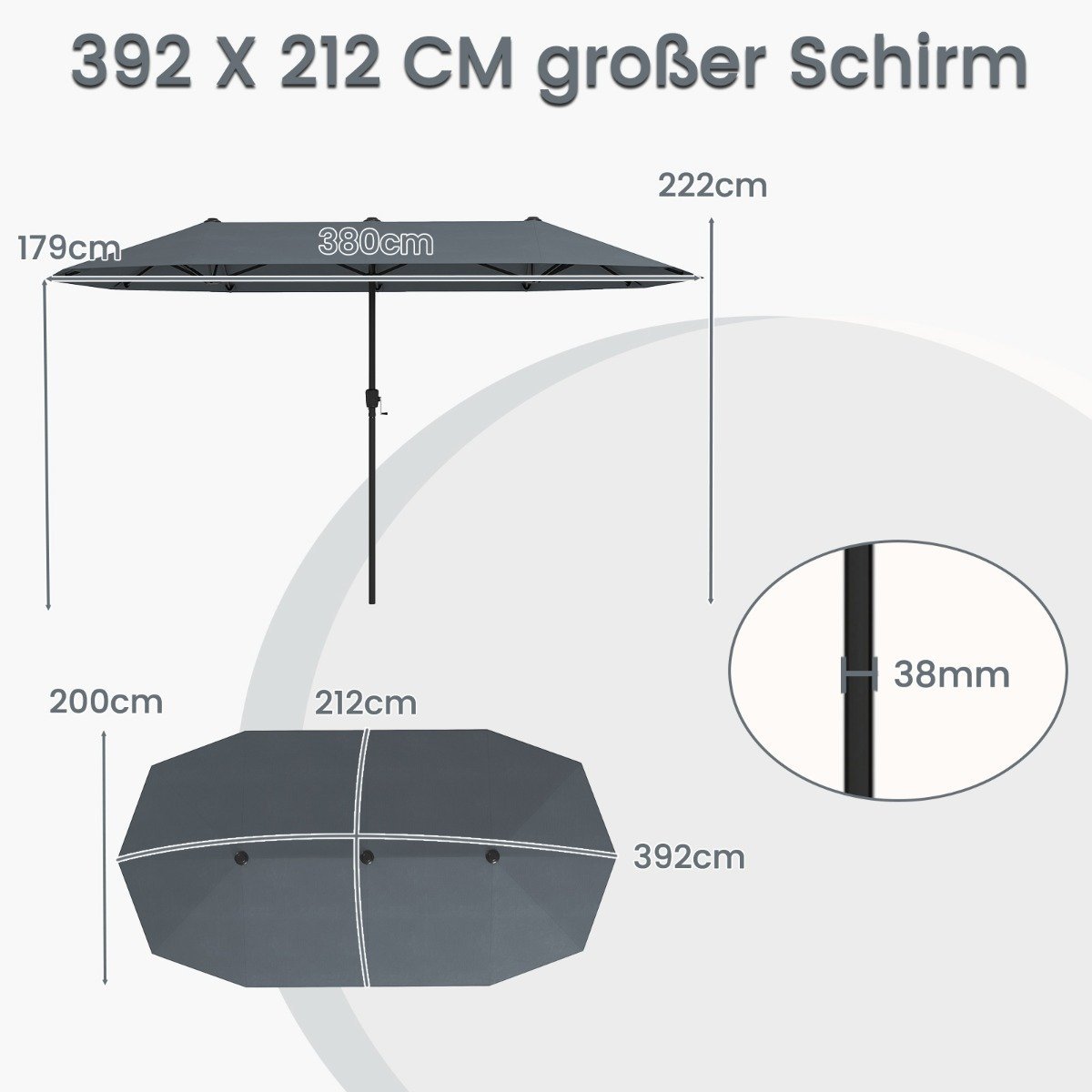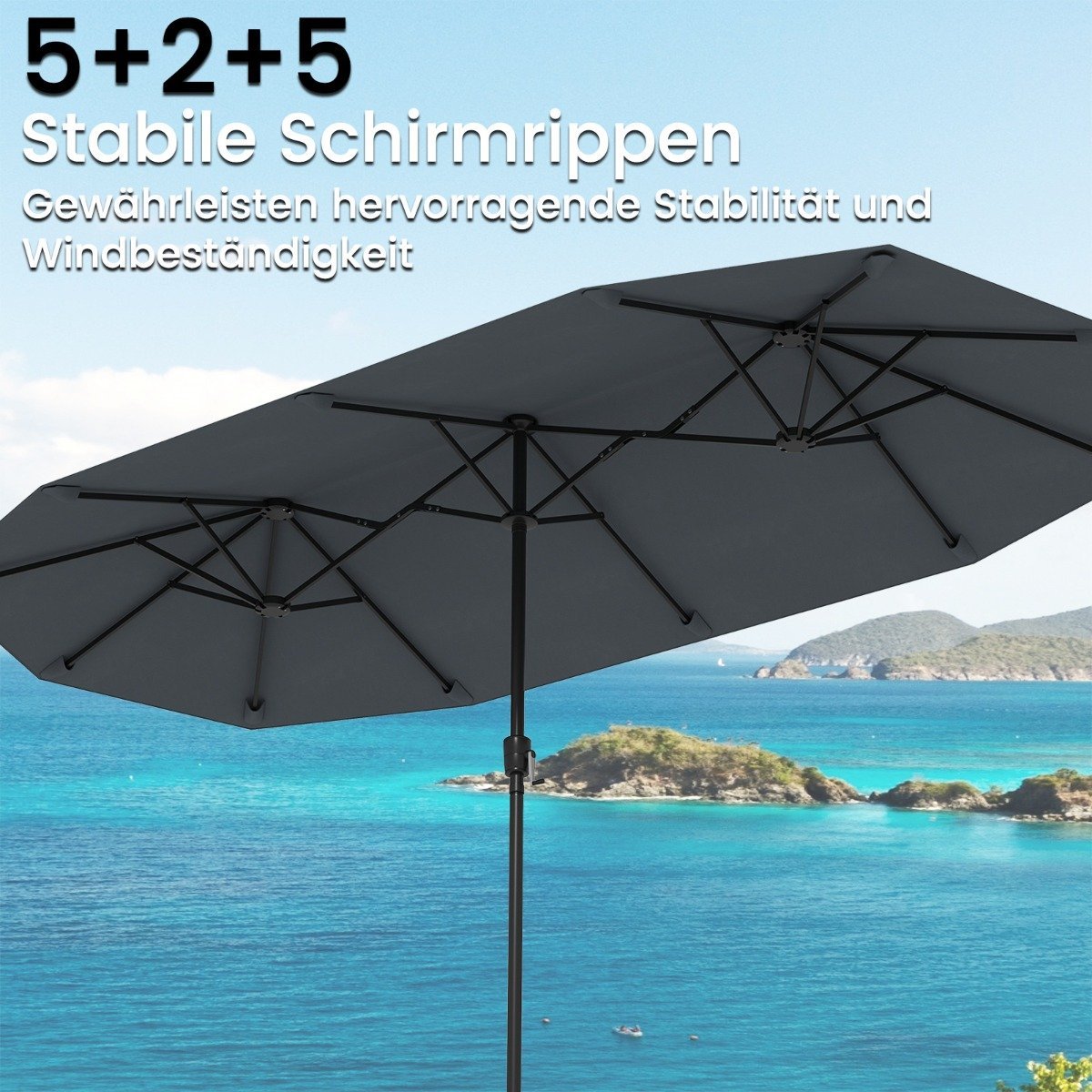 Sukurkite savo asmeninę pavėsingą oazę su šiuo dvigubu skėčiu. Dėl dvipusio dizaino jis suteikia itin platų pavėsį ir puikiai tinka sodui, terasai ar prie baseino.