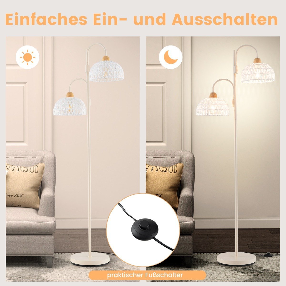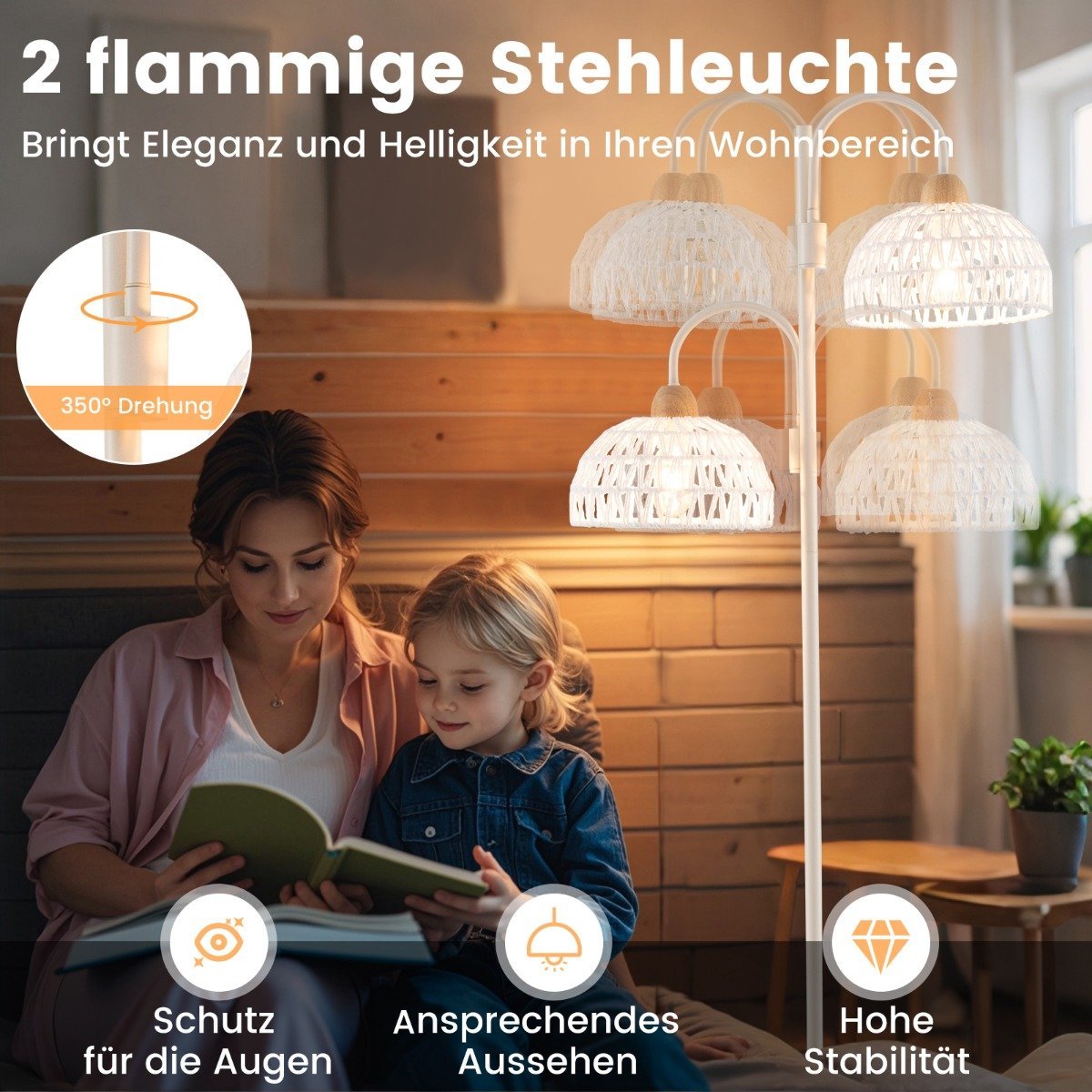 Stilingas ir funkcionalus dvigubas grindinis šviestuvas suteiks elegancijos ir jaukumo jūsų namams. Dėl specialiai austų gaubtų ir galimybės pasukti šviesos kryptį net 350°, šis šviestuvas leis jums mėgautis tiek funkcionalumu, tiek estetiška išvaizda.