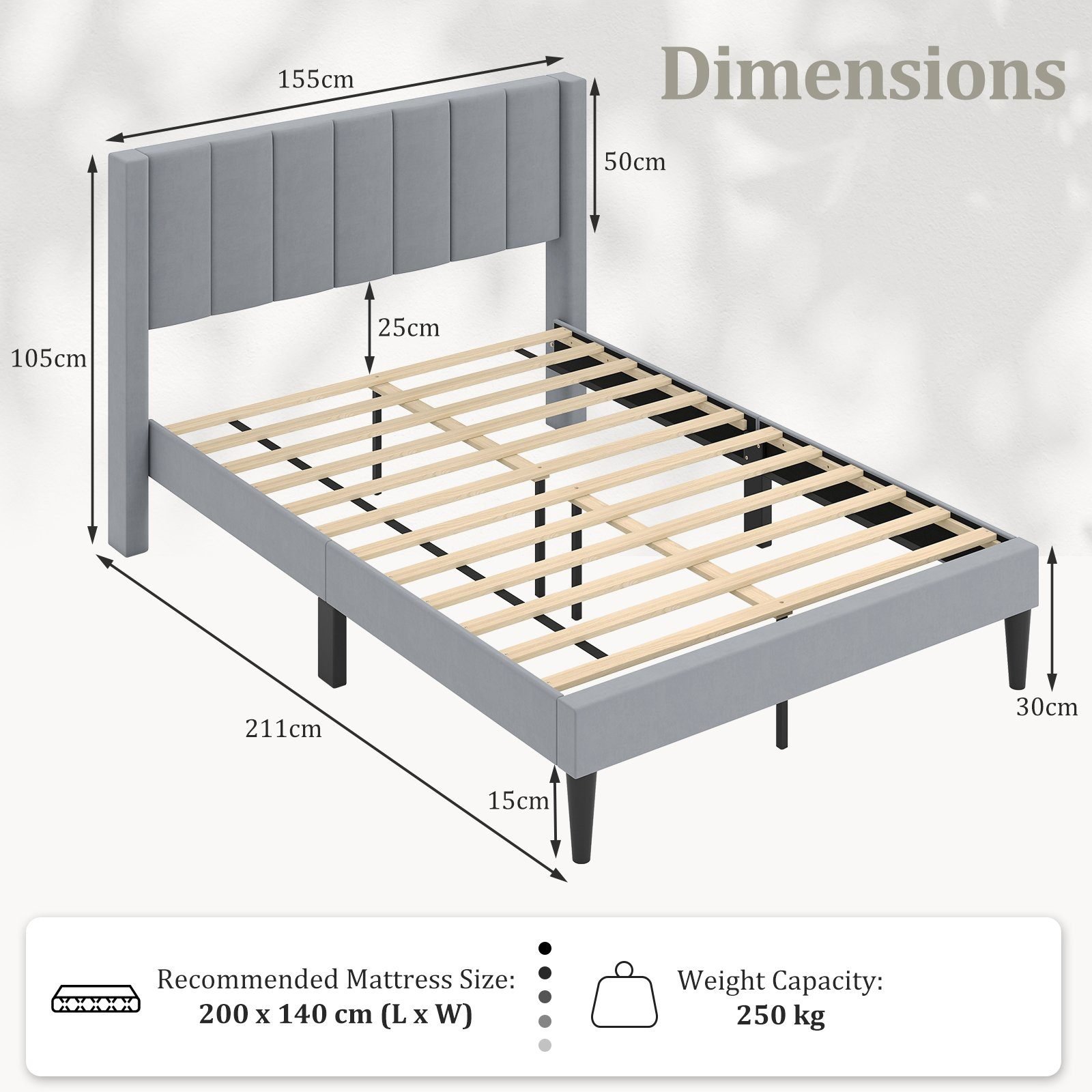 Patirkite prabangų komfortą ir kokybišką poilsį su šia dvigule lova, aptraukta minkštu aksominiu audiniu ir storu putplasčio užpildu. Tvirtos medinės grotelės užtikrina puikų čiužinio palaikymą ir nereikalauja papildomos atramos (box spring), o guminio medžio atraminės kojelės garantuoja stabilumą.