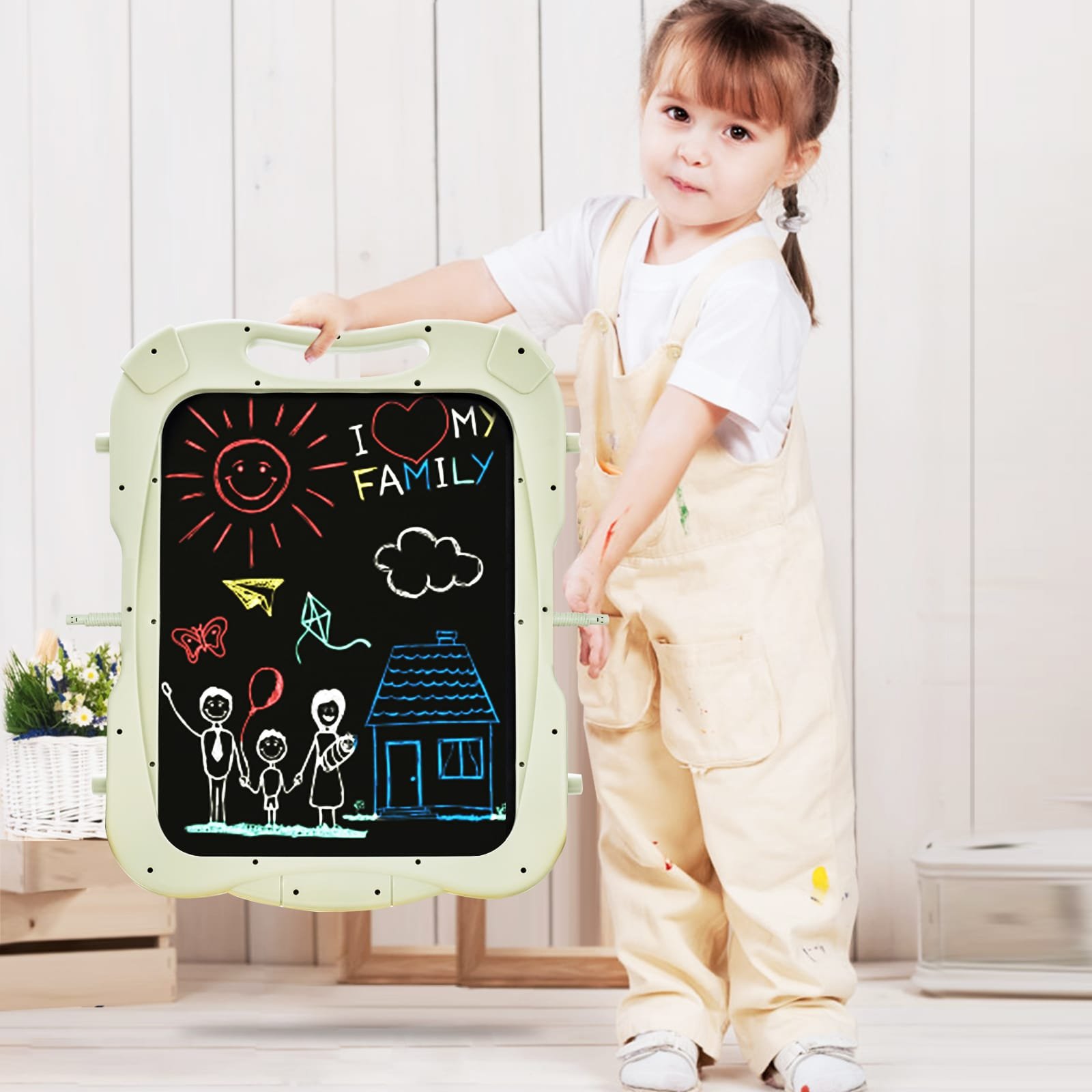 - Nuimama piešimo lenta su rankena: lengvai transportuojama, leidžia vaikui piešti bet kur.