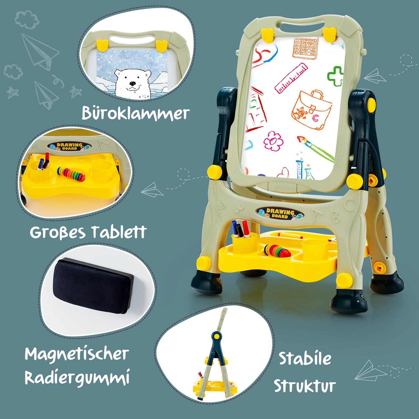 Dvipusė dailės lenta – puiki dovana mažiesiems menininkams, skatinanti jų kūrybiškumą ir meninius gebėjimus. Ši universali magnetinė lenta su integruota kreidelės lenta ne tik stabili ir saugi, bet ir lengvai pritaikoma pagal vaiko poreikius.
