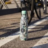 Termosas puoštas patraukliu dviračių motyvu ir užrašais, tokiais kaip „Dviratis“, „Ekstremalus“, „MTB“.