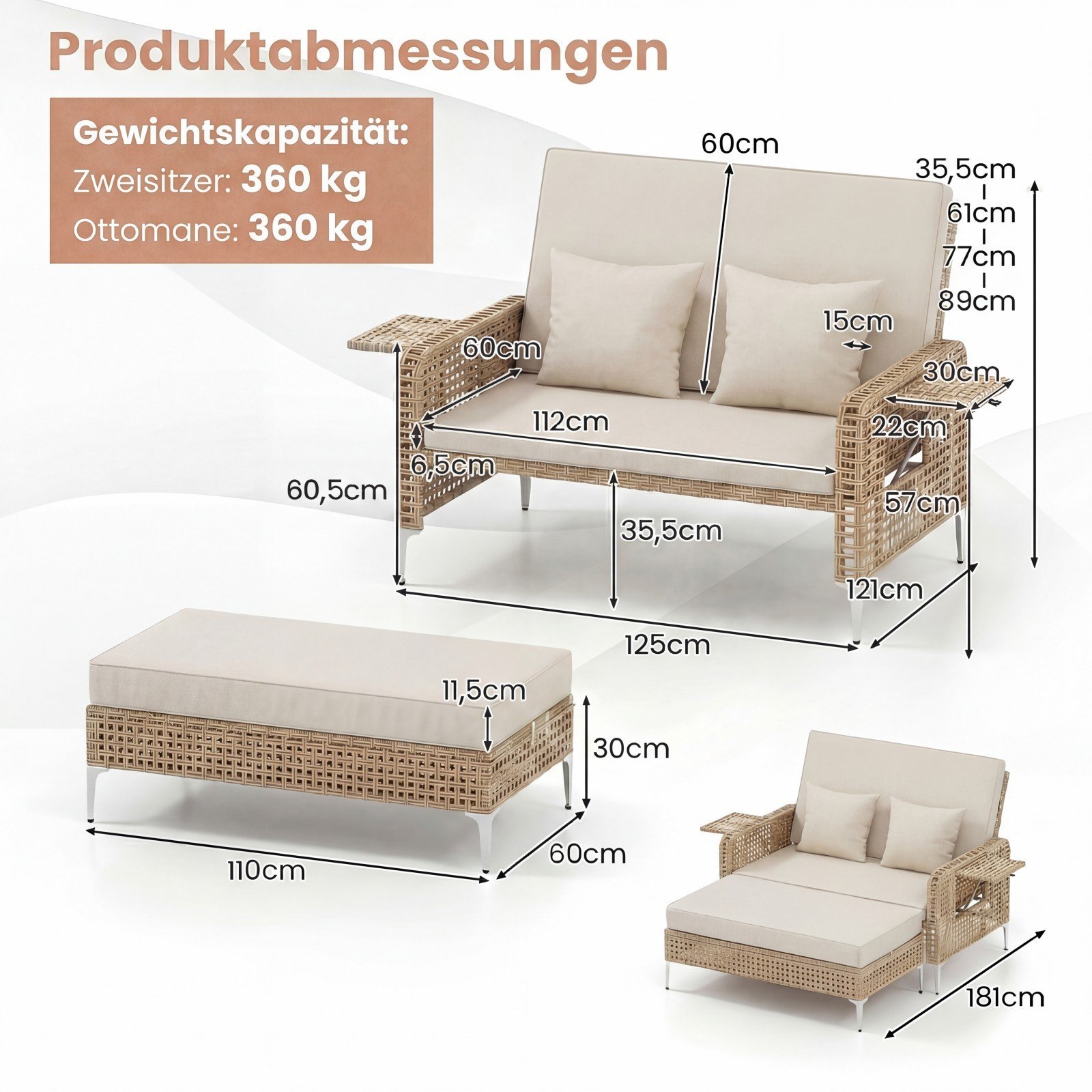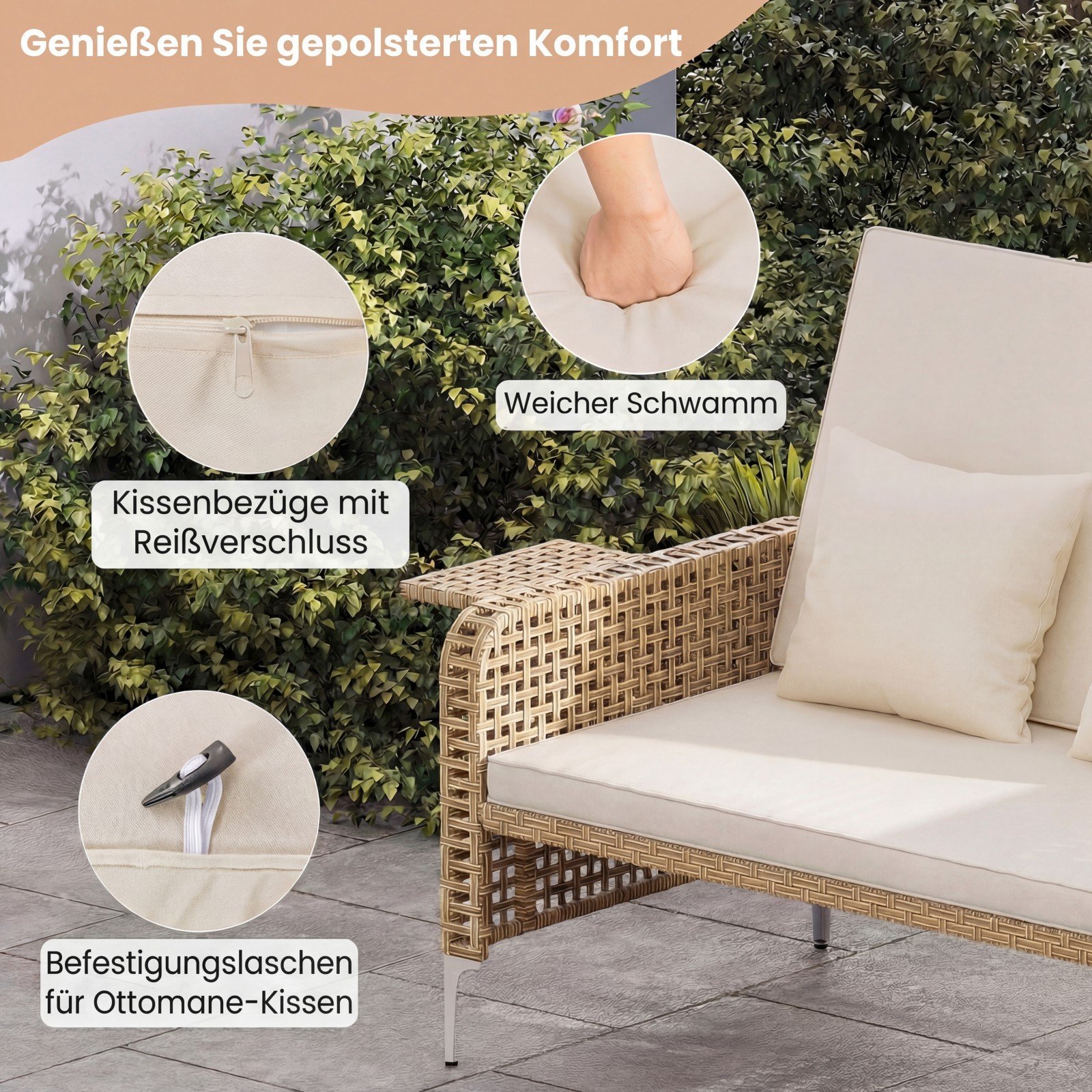 Mėgaukitės išskirtiniu komfortu su šia elegantiška lauko lova ir pufu! Pagaminta iš rankomis pintos PE vytelės, ši dviguba lauko lova yra atspari UV spinduliams ir puikiai tinka naudoti lauke. Reguliuojamas atlošas leidžia patogiai pasirinkti Jums tinkamiausią poilsio poziciją. Stori ir minkšti paminkštinimai su nuimamais užvalkalais palengvina priežiūrą.