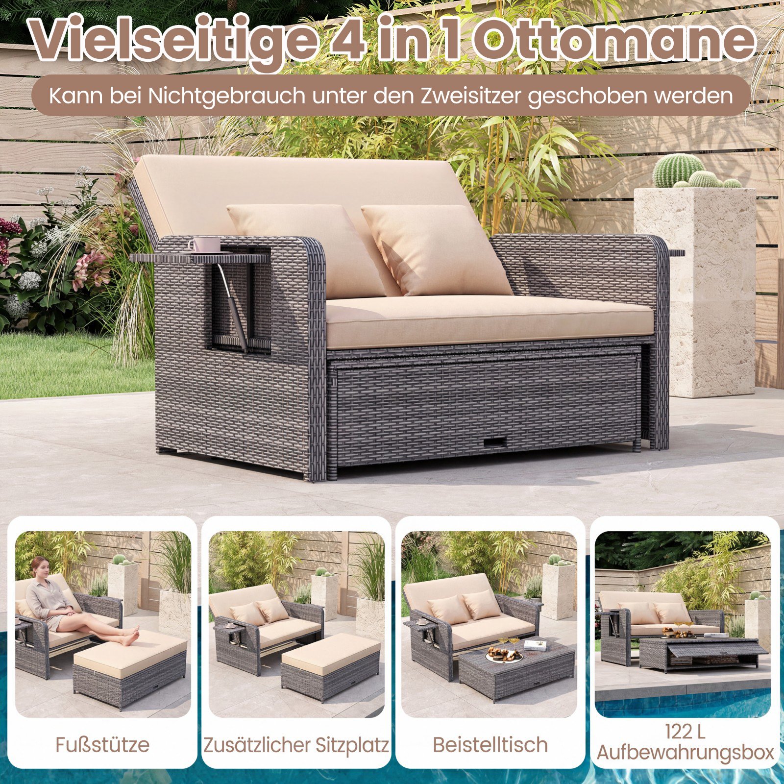 Dvivietė polirataninė sofa-lova su reguliuojama atrama nugarai ir išskleidžiamais šoniniais staliukais (Smėlio)