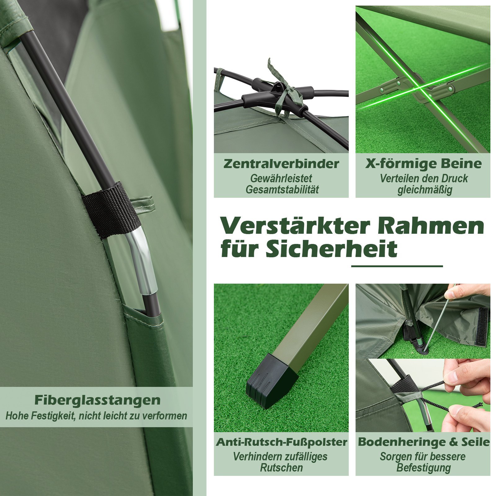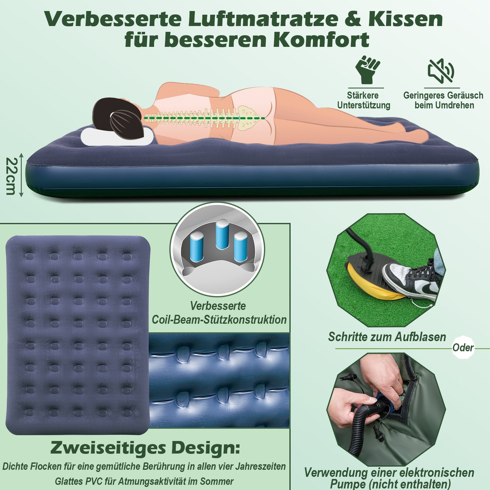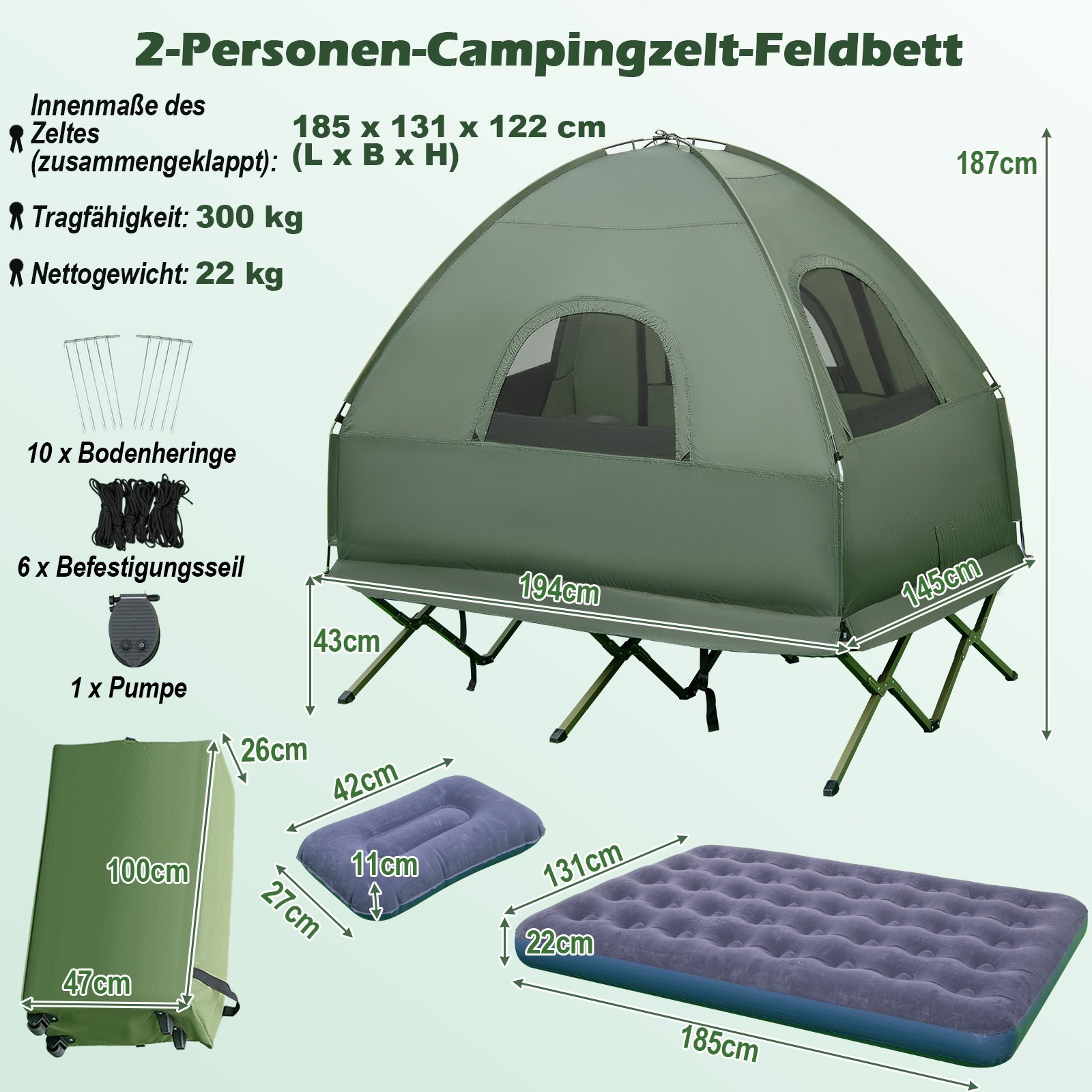 Dvivietė turistinė palapinė-lova su pripučiamu čiužiniu ir miegmaišiais 5-in-1(Žalia)
