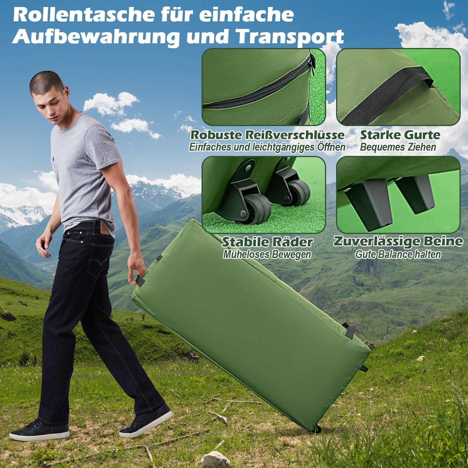 - Sulankstoma ir nešiojama konstrukcija su transportavimo krepšiu su ratukais ir greito pripūtimo pompa.