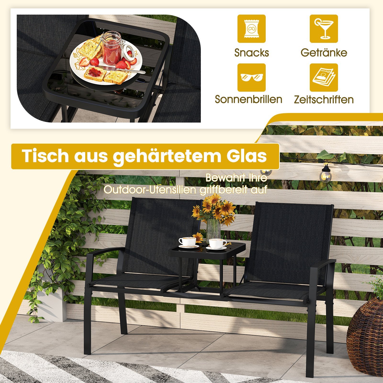 Dvivietis sodo suoliukas su integruotu staliuku (Juoda)