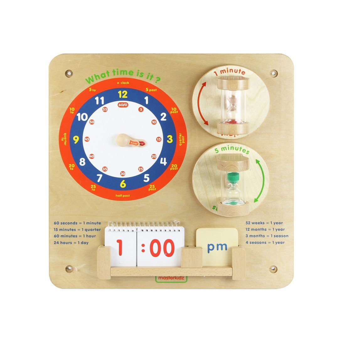 Edukacinė lenta „Masterkidz“ gali būti tvirtinama tiesiai prie sienos arba naudojama su „Masterkidz Flex“ sistema – tiek montuojant prie sienos, tiek kaip atskiras, laisvai stovintis elementas. Ši lenta skirta mokytis skaityti laiką pagal klasikinius (rodyklinius) laikrodžius. Joje integruotas laikrodžio ciferblatas su judančiomis rodyklėmis, kurias vaikas gali laisvai sukioti. Suaugęs asmuo gali padiktuoti konkretų laiką, o vaikas turės nustatyti rodykles taip, kad laikrodis jį rodytų. Vaikas taip pat gali žaisti ir mokytis savarankiškai, nes rinkinyje yra sąsiuvinys su pavyzdžiais, nurodančiais įvairius laiko momentus. Vartydamas puslapius, vaikas nustato juose pateiktą laiką. Lentoje taip pat pateikiami laiko vienetų tarpusavio ryšiai: kiek sekundžių sudaro minutę, kiek minučių – ketvirtį valandos, kiek minučių – valandą, kiek valandų – dieną ir panašiai. Ši informacija padeda vaikui lengviau suprasti ir įsiminti pagrindinius laiko matavimo vienetus bei jų tarpusavio santykius. Kitas lentos elementas – du smėlio laikrodžiai, su kuriais mažylis gali patirti, kiek trunka viena ir penkios minutės.