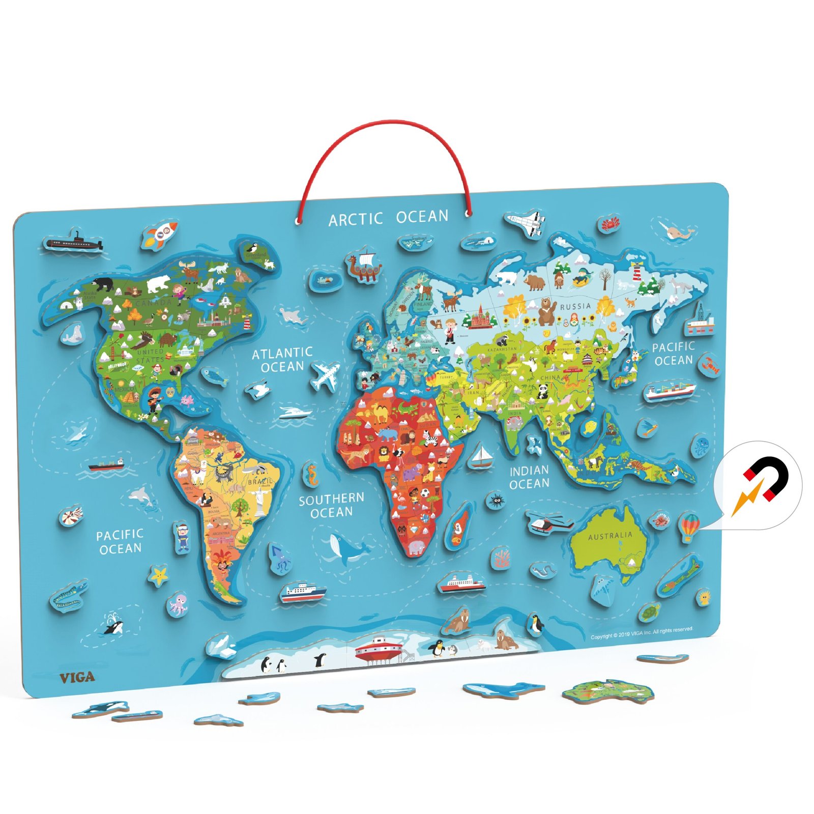 Kokybiškai pagaminta lenta su magnetiniais elementais sujungia mokymosi naudą su smagiu žaidimu. Ant lentos galima dėlioti medinius elementus: žemynus, laivus, lėktuvus, raketas ir vandenynų gyvūnus. Žemėlapis su užrašais anglų kalba padės mokytis šios kalbos pagrindų.