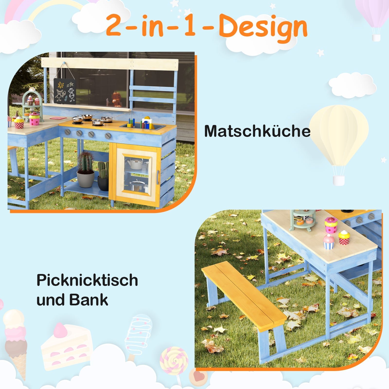 Paskatinkite vaikus sukurti smagių puotų su mūsų lauko purvo virtuvėle! Pagaminta iš tvirtos eglės medienos, ši virtuvėlė sukurta atlaikyti valandų valandas intensyvių žaidimų. Integruotas pikniko stalas su suoliuku bei gausybė priedų suteiks begalę valgymo ir gaminimo patirčių, lavinančių kūrybiškumą ir vaizduotę.